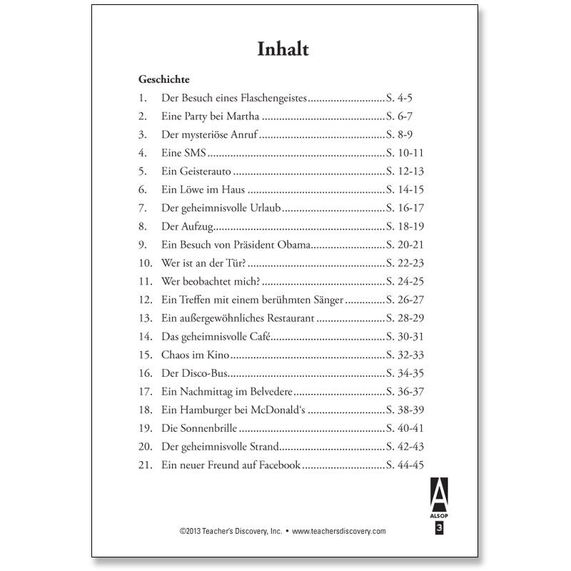 Twenty-one short, short stories in the present tense engage teen readers with one-page topical tales—now in German! Thorough (written and oral) discussion questions follow each chapter and ensure a beginning student's complete understanding of the story and dialogue. Use each as a filler lesson, or wrap a unit around the interaction and vocabulary. Includes teaching suggestions; a complete glossary, listed by chapter, is in the back of the book.