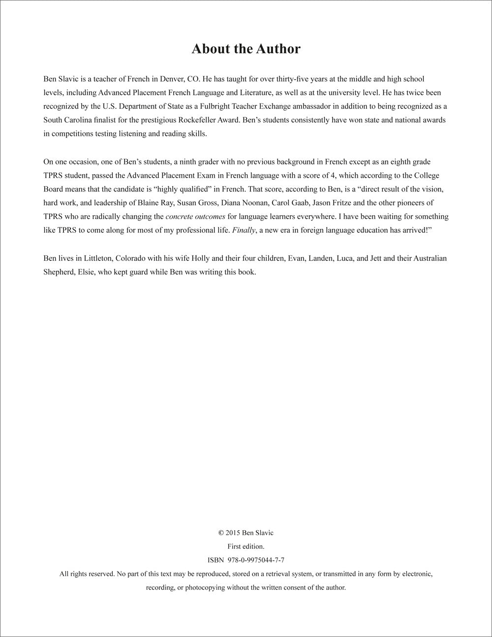 "After 10 years of trying to implement CI/TPRS methods into my teaching, I changed school districts and was told that I had to use traditional methods to teach. I hated going to work the entire year. So I changed districts yet again and was told that I had the freedom to use any methods that I wanted. But I felt like I had forgotten all of my CI/TPRS training. I couldn't afford to attend a summer conference and I desperately needed something that would help me relearn and start out strong for my new students. So when I found The BIG CI Book, I felt relief and gratitude immediately. I bought it with my own money. And when it arrived, I poured through it in two days devouring every detail. It has become my main guide book now. I'm so grateful that Ben Slavic took the time to actually write all of these tools down. I feel confident that I am a more effective teacher when using these methods. Thank you for this resource. Teaching is rewarding again."