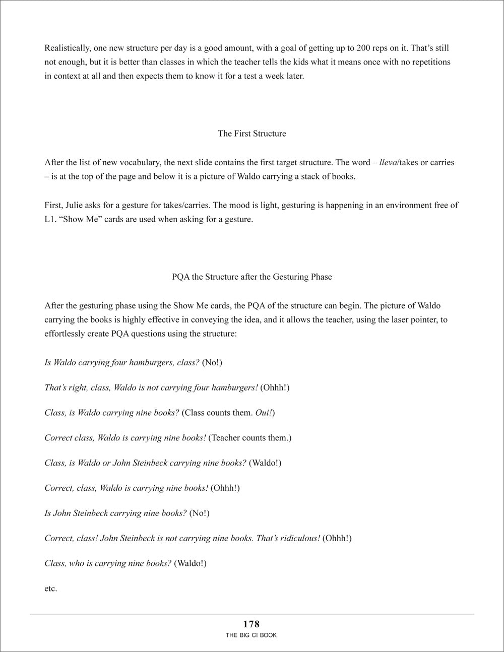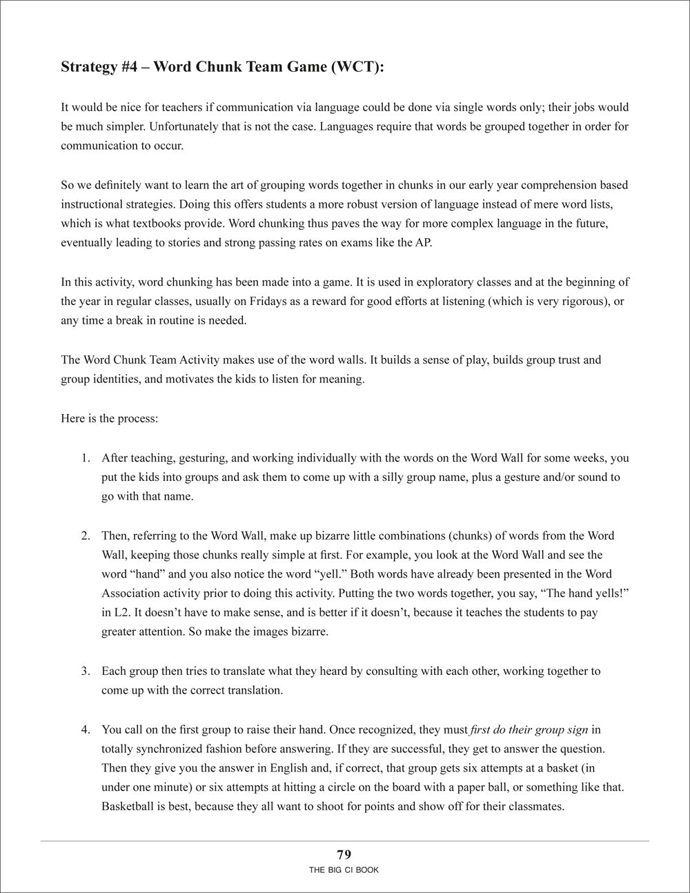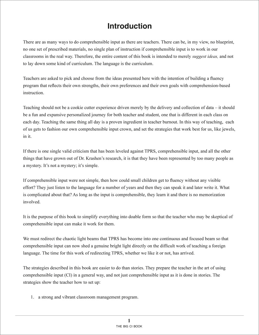 The Big CI Book Contains:Fourteen Skills that form the foundation of TPRS/CI, including how to circle, the speed at which to move, how to clarify, and how to read students and know if the input is really getting in.
