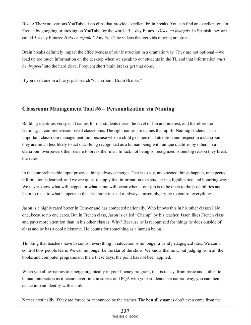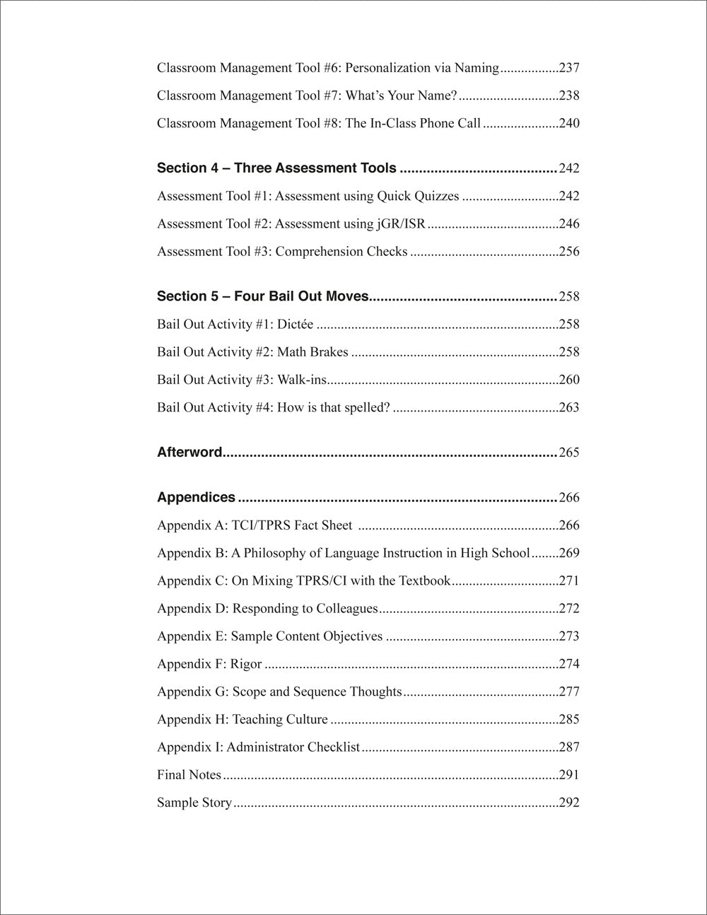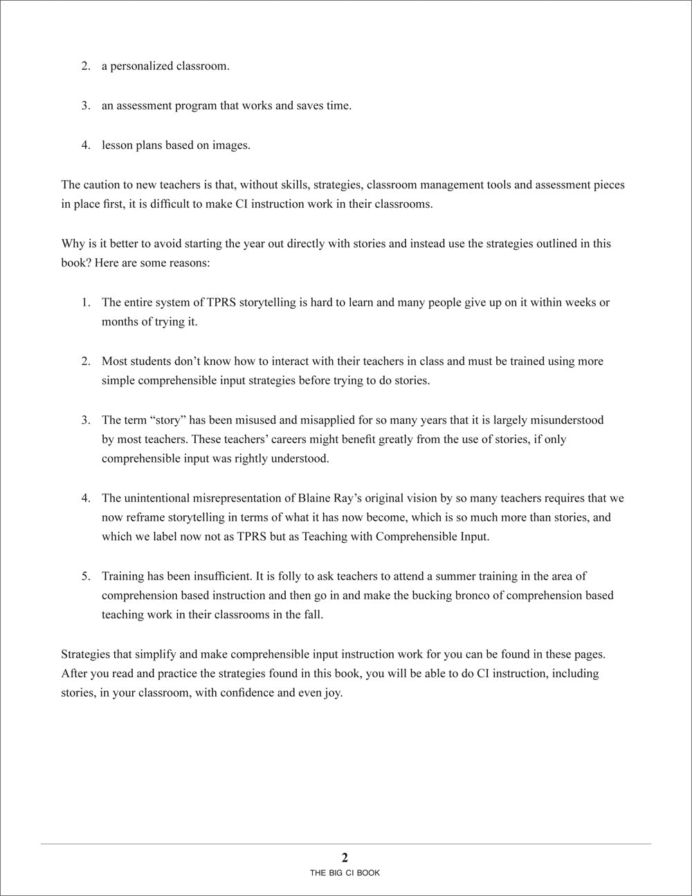 The Big CI Book Contains:Fourteen Skills that form the foundation of TPRS/CI, including how to circle, the speed at which to move, how to clarify, and how to read students and know if the input is really getting in.
