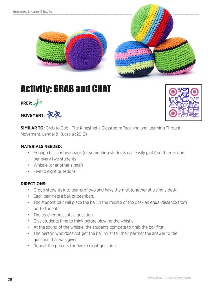 Balloon Bounce, Beach Ball Skee-ball®, Bucket Sort, Grab and Chat, Hot Seat, Popcorn Challenge, and many more! Improve student performance using games and fun activities that work with any lesson you are struggling to reinforce. Twenty-three different game activities to get kids up and moving around while perfecting that lesson or topic. Game materials are not included, but are basic things that almost every teacher has or can borrow. Each activity features a supply list, the amount of setup required, the degree of student activity, directions, and suggestions on how to adapt it to varying proficiency levels. Plus, there are options and tips to help with classroom management. As a bonus, each chapter includes a QR code—just scan it to watch a classroom video example of the activity in action!