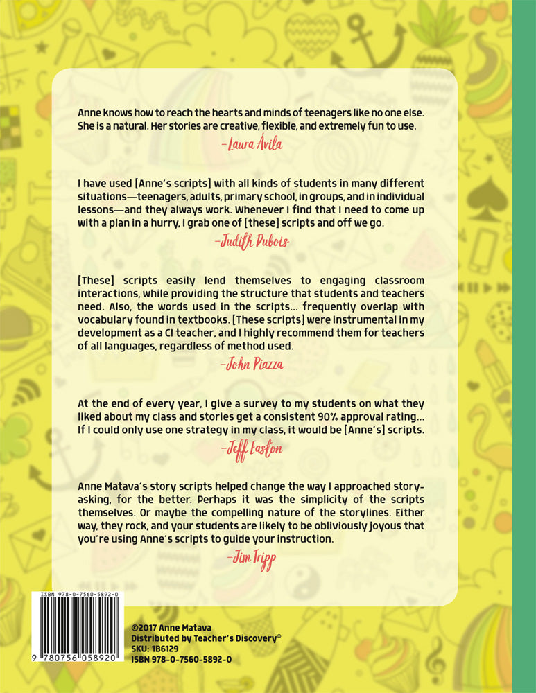 Anne Matava's story scripts consist of engaging plots that appeal to the teenage brain, with windows left wide open to invite in kids' creative contributions. The minimum result you can expect is a cohesive and dryly humorous story even if students aren't "on" that day... and if they are a little too "on" you'll still get something that does the job! (If they are in the zone, well, that's where legendary recurring jokes are born and magically smooth acquisition occurs.)