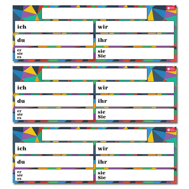 German. Three 13 x 38-inch laminated verb charts, three dry-erase markers.