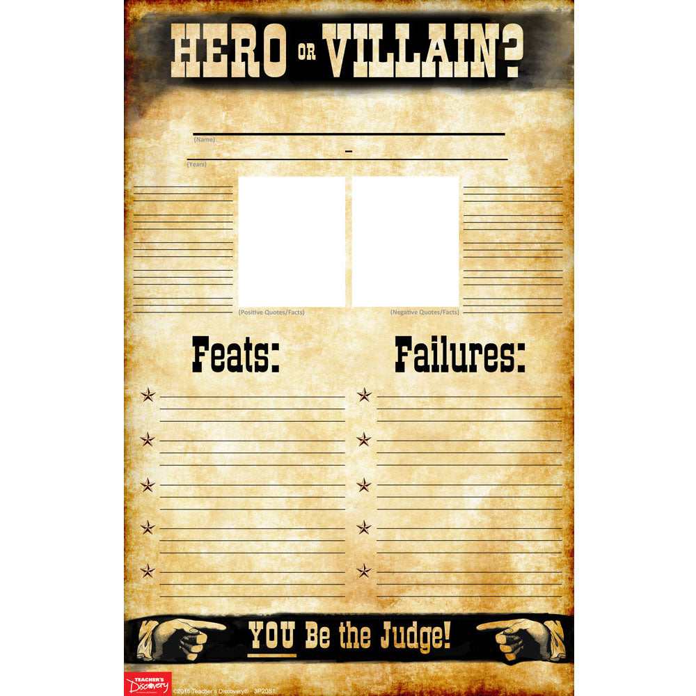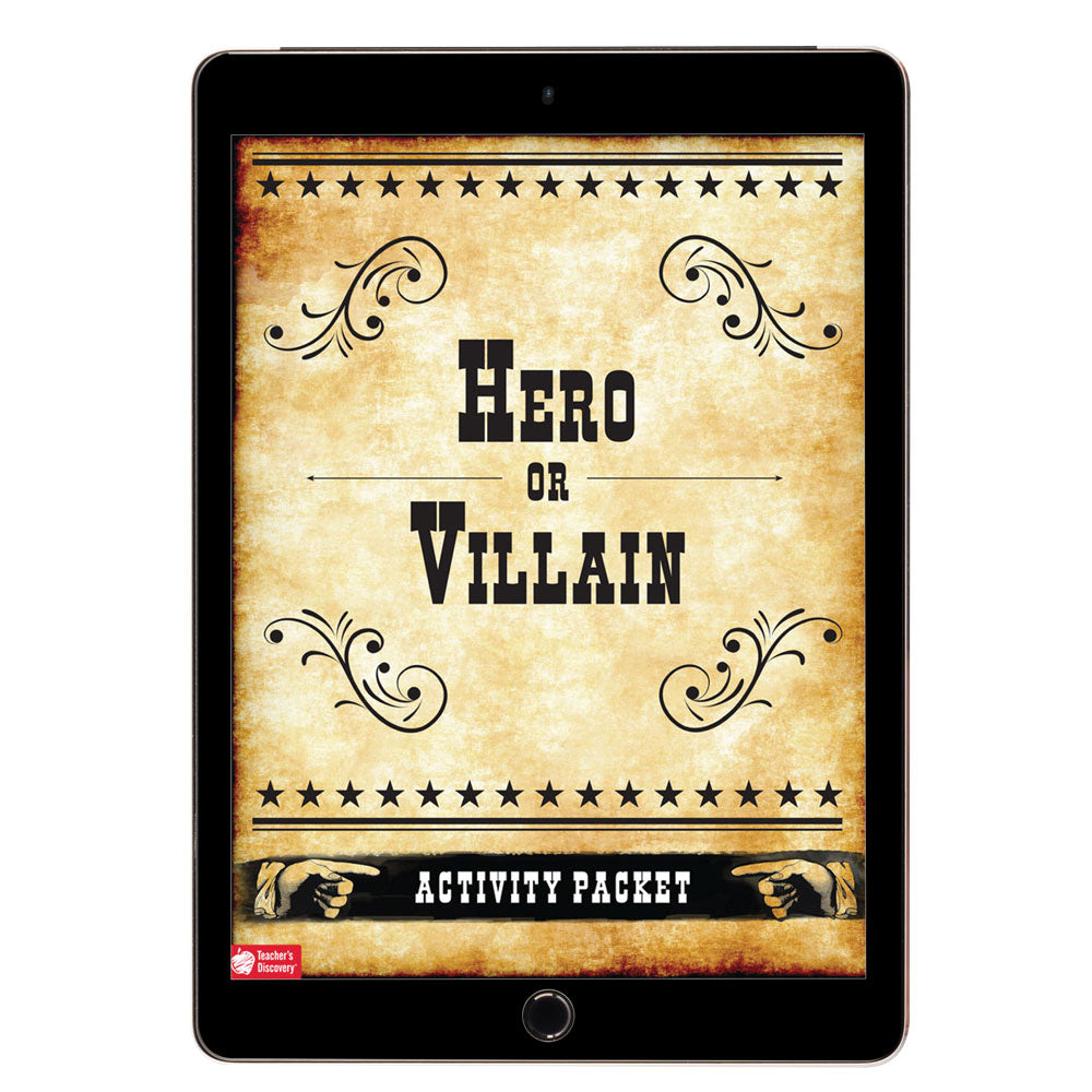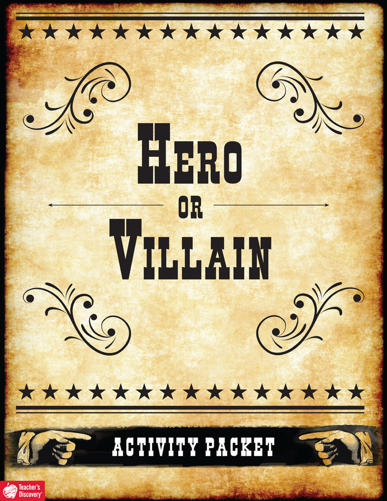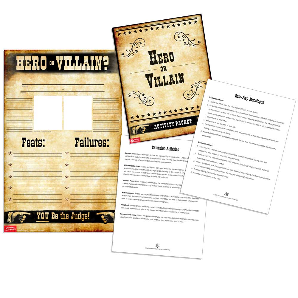 This 18-page downloadable packet provides over 20 activities and research topics. Students will analyze a historical person on their heroic or villainous attributes. They will complete a job resume, file a villainous police report, write a eulogy, debate with a partner over whose person is more heroic, and more!