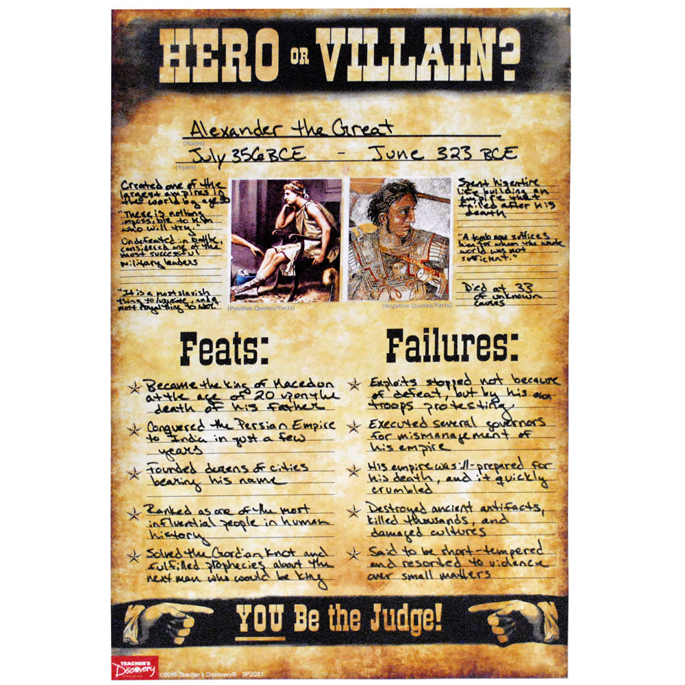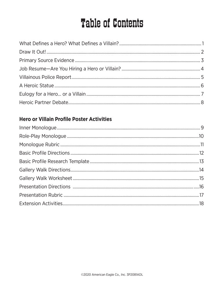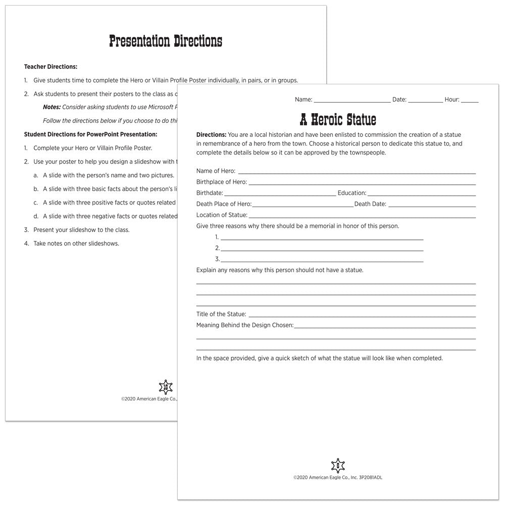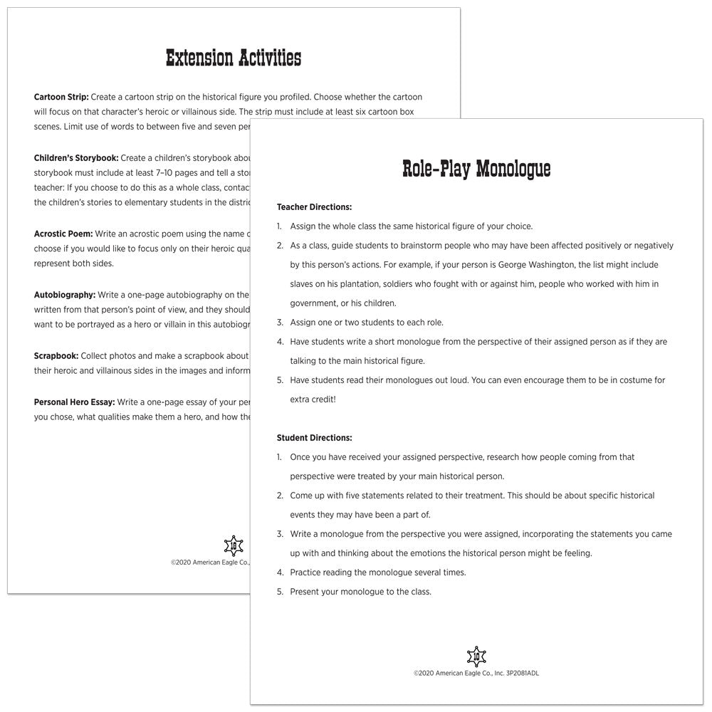 This 18-page downloadable packet provides over 20 activities and research topics. Students will analyze a historical person on their heroic or villainous attributes. They will complete a job resume, file a villainous police report, write a eulogy, debate with a partner over whose person is more heroic, and more!