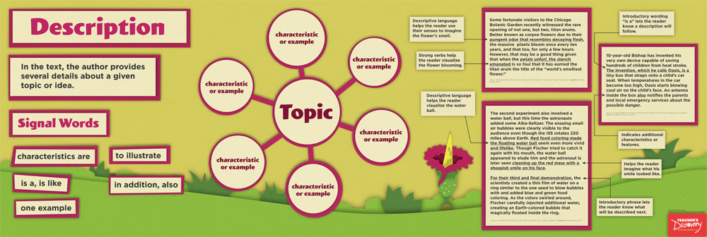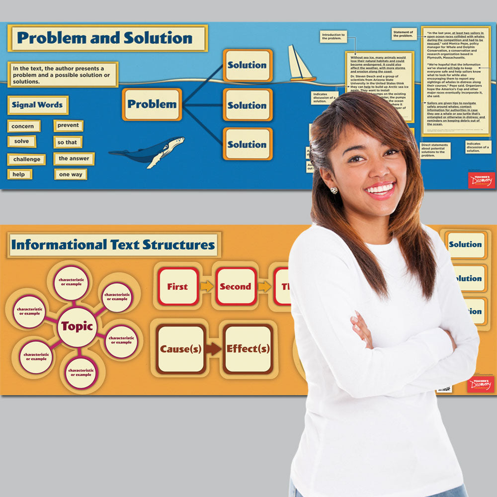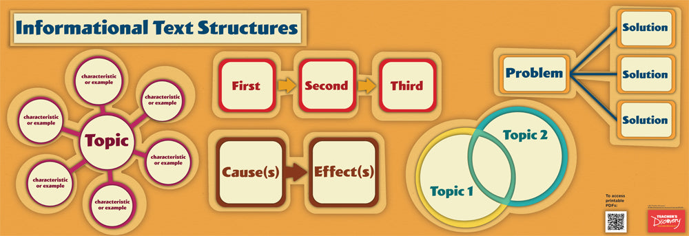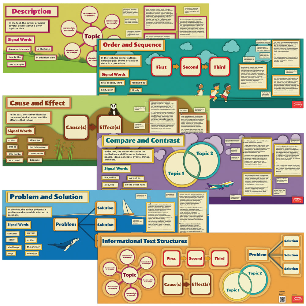 Explore how information within a text is organized. Each text structure poster includes a definition, signal words, graphic organizer, and annotated examples. The additional interactive graphic organizer poster can be used to diagram texts or brainstorm writing, or use the QR code to access printable graphic organizers.