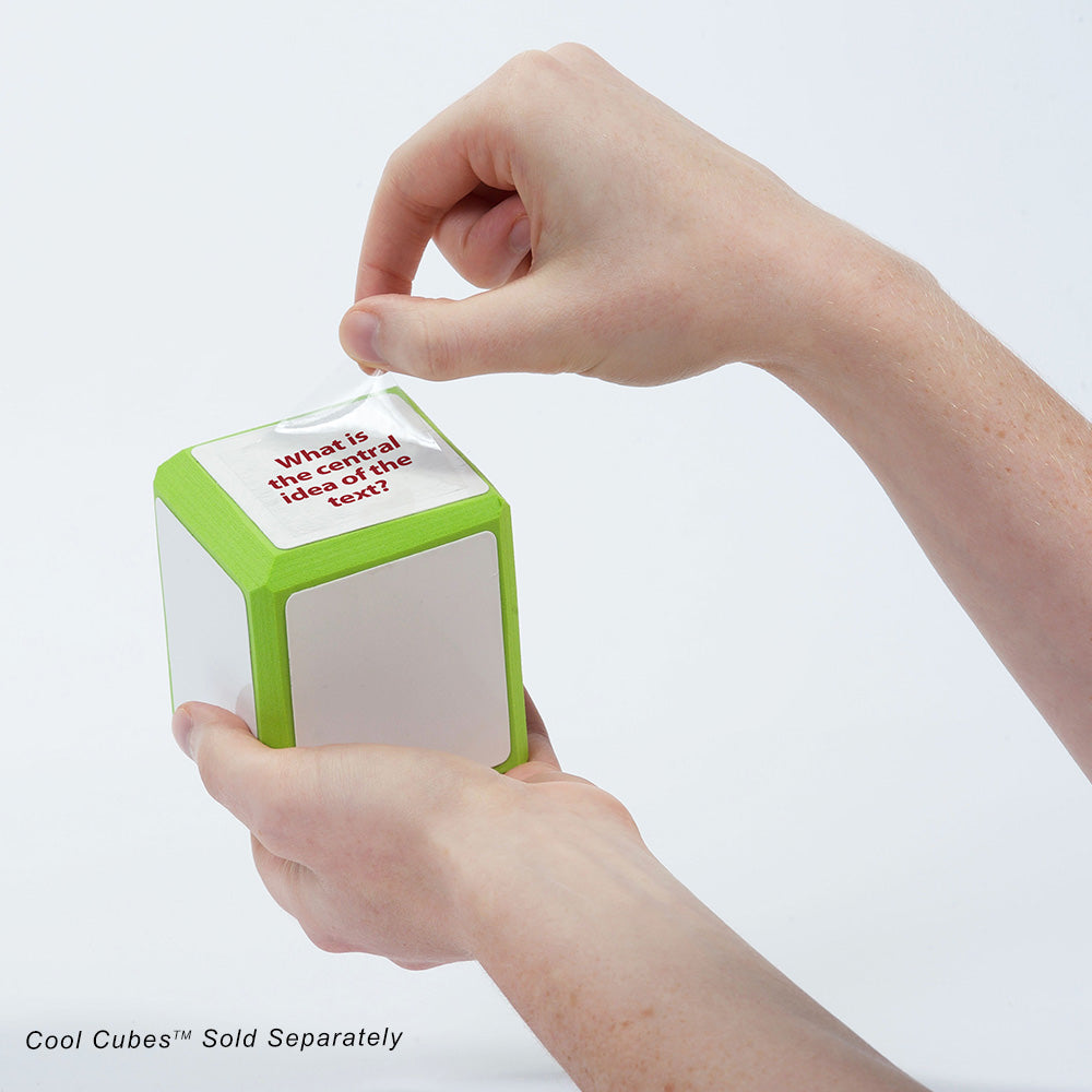 Prompt students with ELA clings! After reading a text, students roll the dice and answer the prompt that pops up. Perfect for spicing up your lessons and engaging students. Use individually or with groups. Each reusable prompt cling fits perfectly on three-inch Erasable Cool Cubes. Each set includes 48 clings—24 literary text prompts and 24 informational text prompts. The complete set will fit on a total of eight 6-sided cubes (equals two sets of 3-inch Cool Cubes).