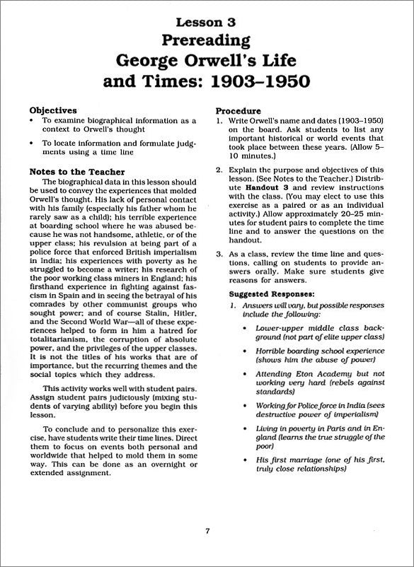 George Orwell's classic novel of a dystopian future—is it here? This curriculum unit includes 10-12 classroom-tested lesson plans. Time-saving reproducible handouts, quizzes, and teaching strategies are included to sharpen critical-thinking skills.