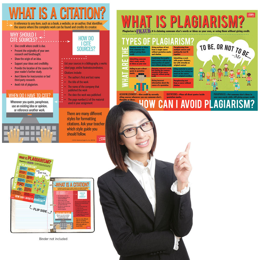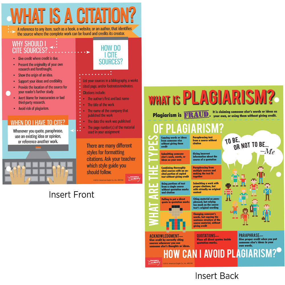 Citation and plagiarism posters and a 2-sided binder insert are excellent resources for students who are learning how to plan and write a research paper. These resources graphically show students why it’s essential to avoid plagiarism and how to cite their sources. The binder insert is hole-punched for any three-ring binder.