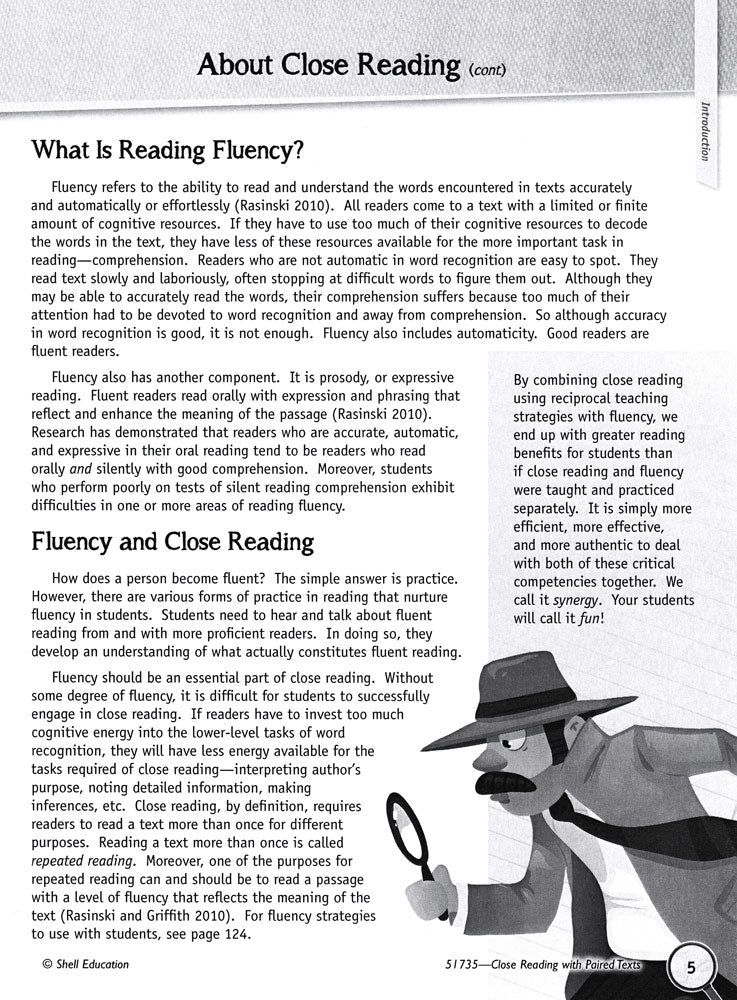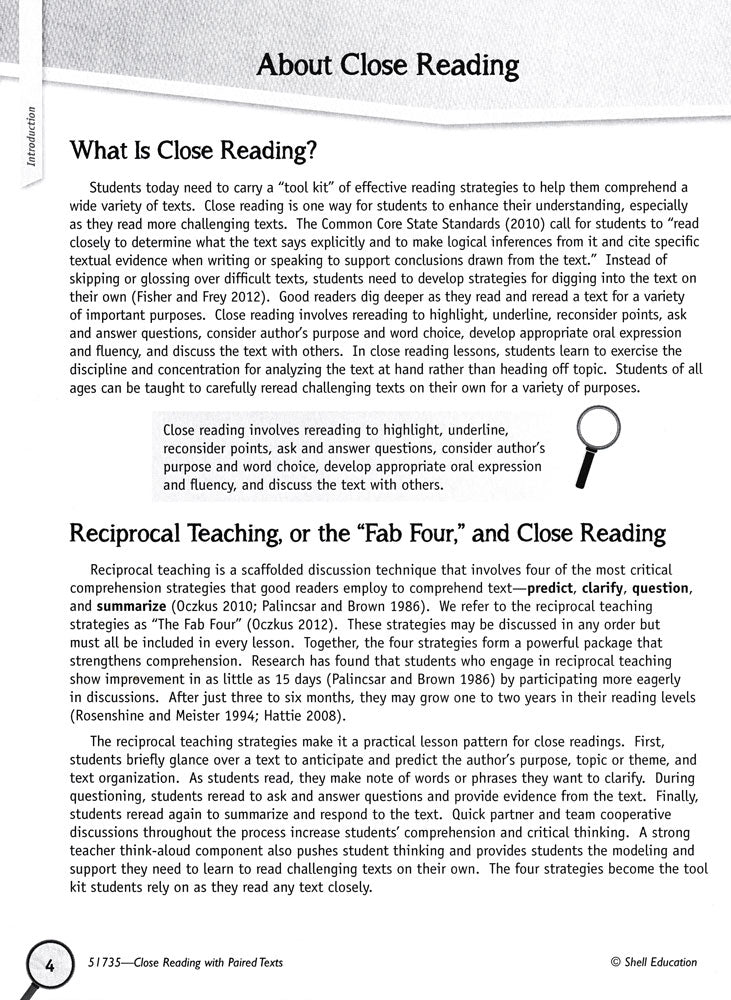 This book focuses on the research-based strategy from Common Core State Standards: close reading of paired texts. Students’ fluency and comprehension skills improve by learning close reading strategies for fiction and non-fiction texts. Activities and lessons focus on the reciprocal teaching method, which makes these strategies exciting and interactive for students. There are options for scaffolding and open-ended activities to meet the needs of all students!