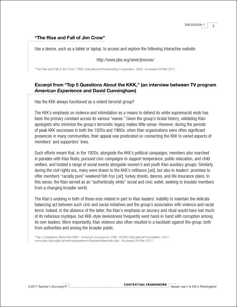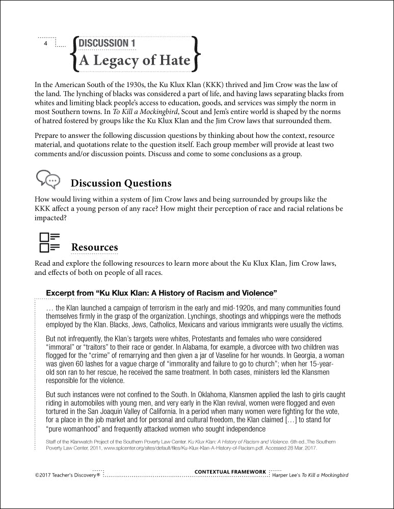 Authors write about what they know, their experiences, and the world in which they live. Context-based questions give students the framework for a deeper analysis and understanding of Harper Lee’s To Kill a Mockingbird.