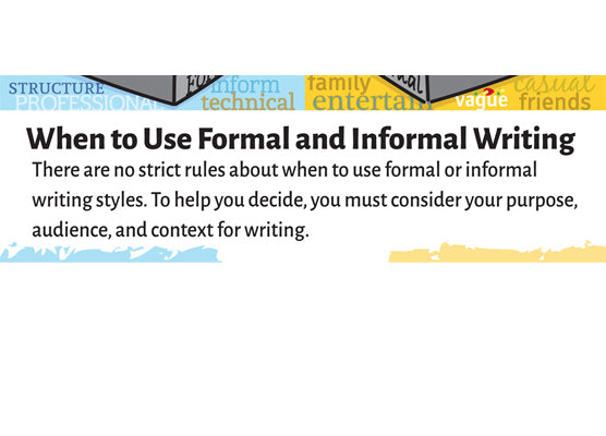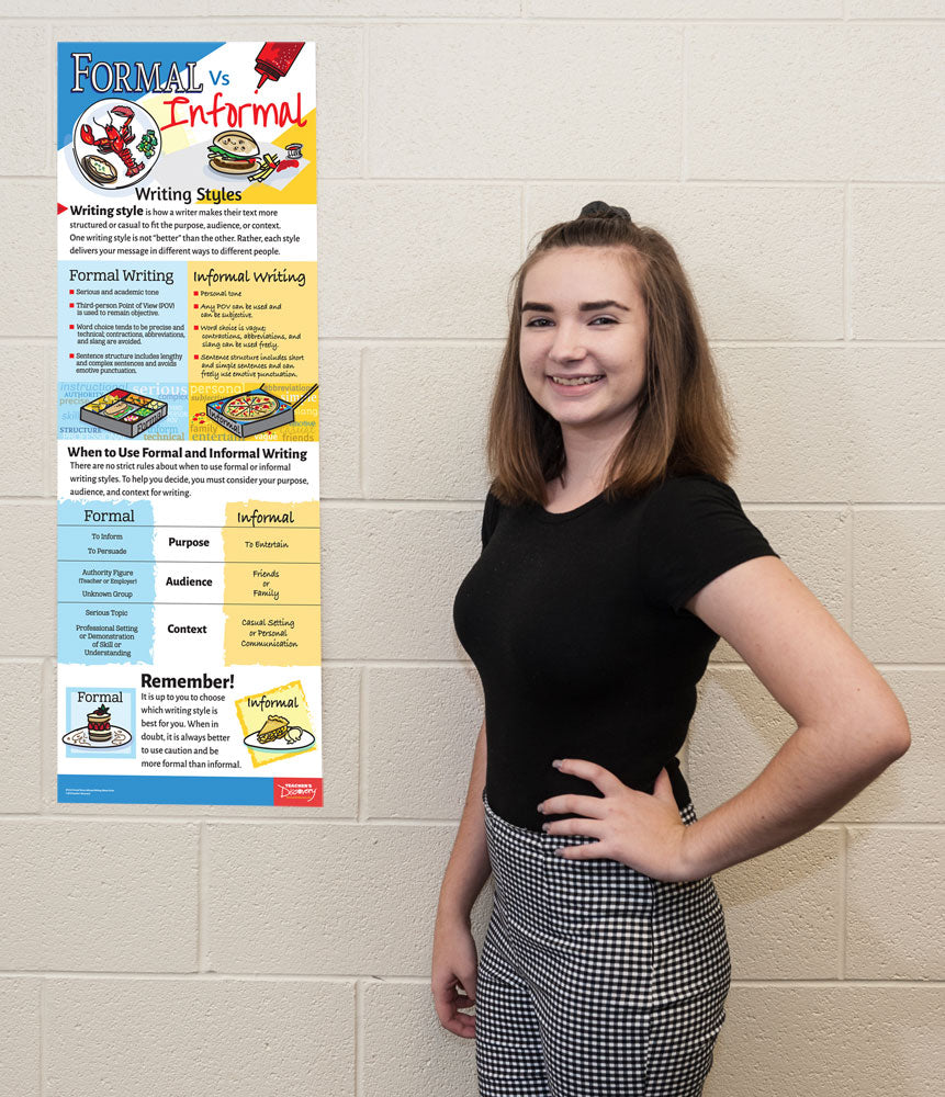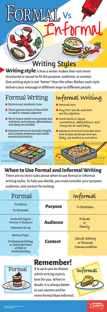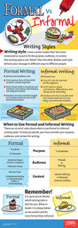 The Formal vs. Informal Writing Styles poster makes sure you never have to answer that question again. Comparison explanation charts and clever metaphorical food illustrations clarify the necessities and reasons for each style.