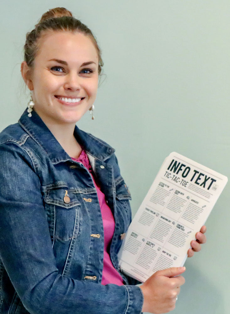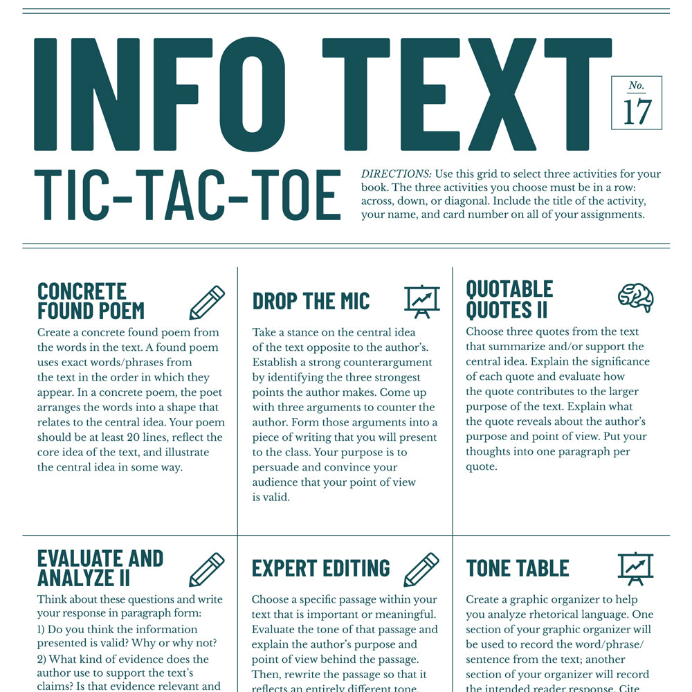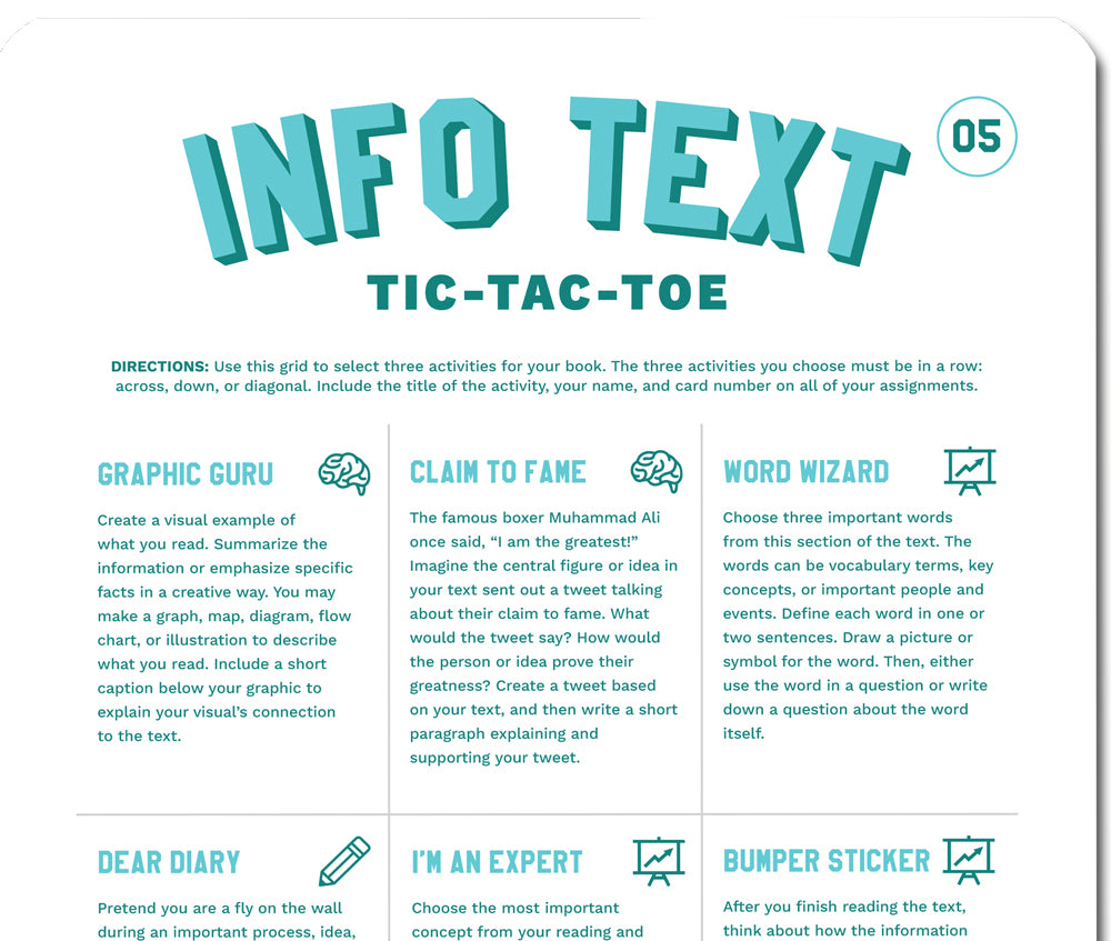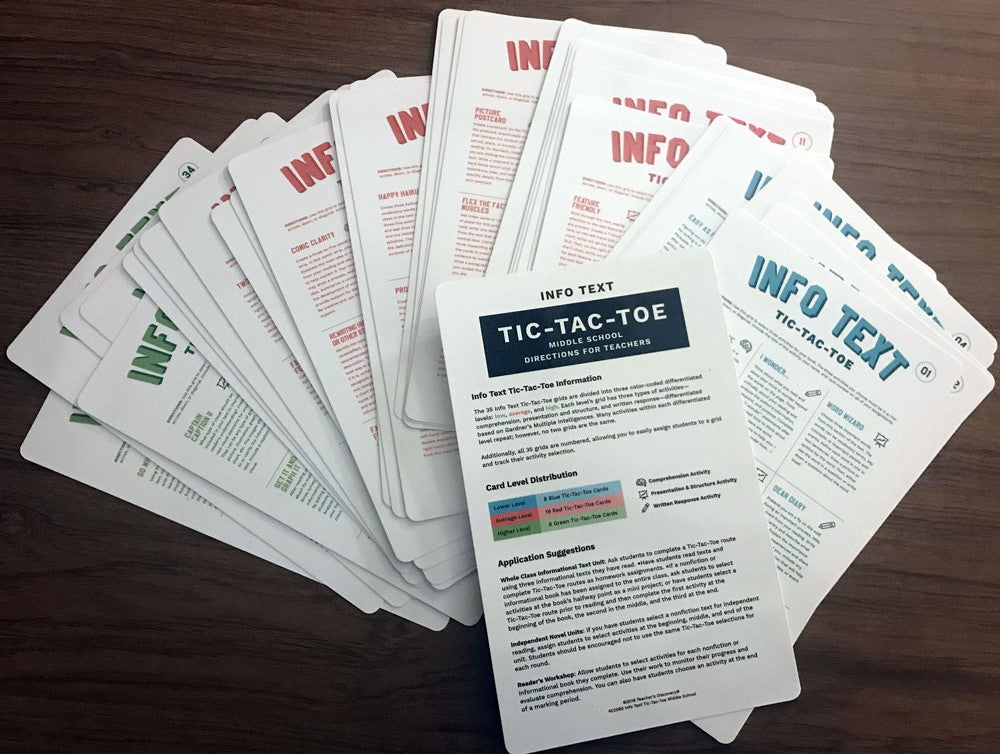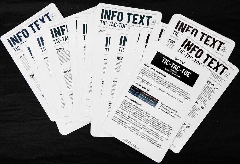 Both high school and middle school card sets have a total of 50 activities spanning 35 Tic-Tac-Toe cards that excite every student and work with any nonfiction text. Many activities within each differentiated level repeat, but no two cards are the same. Middle and high school sets each include enough cards for oversized classes. Info Text Tic-Tac-Toe is perfect for energizing your informational text unit.