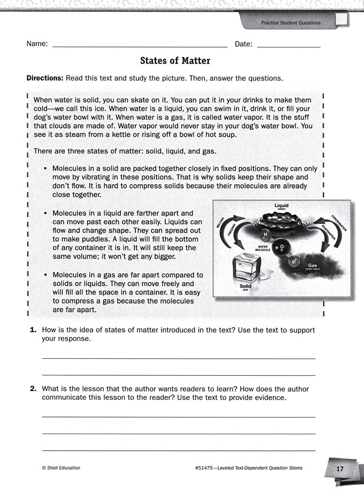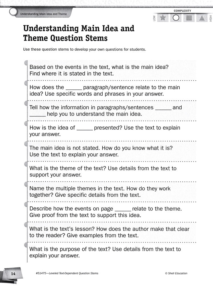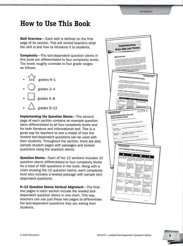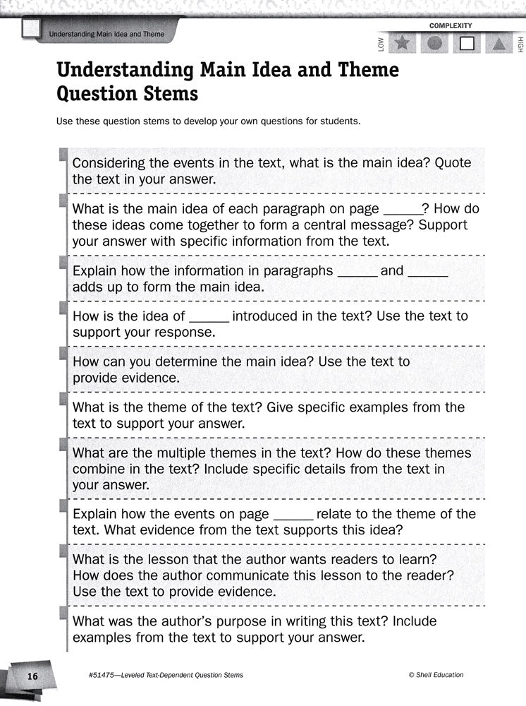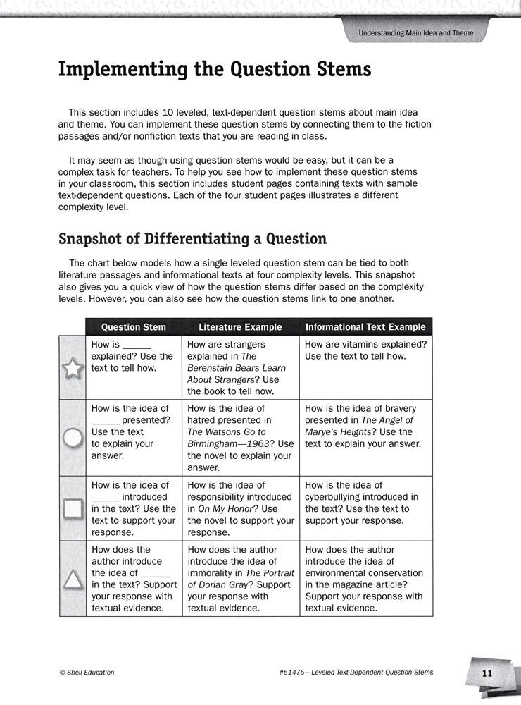 Focus on the same reading standard or objective with the whole class and meet the individual ability level of each of your students. Discrete identifiers on handouts allow you to quickly and easily choose question stems and activities written at a variety of levels for grade ranges K–1, 2–4, 5–8, and 9–12 without drawing attention. Resource addresses both literature and informational texts.