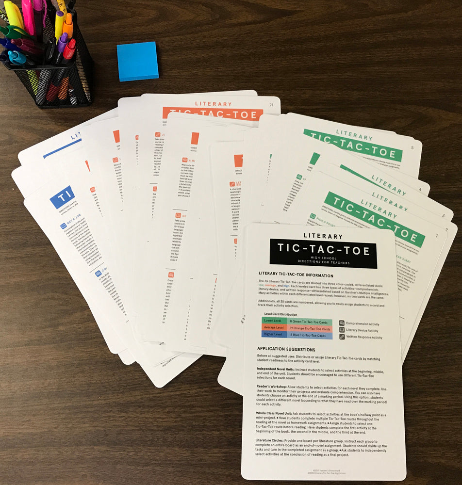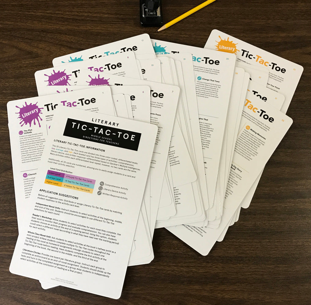 Both high school and middle school card sets have a total 50 activities spanning 35 Tic-Tac-Toe cards that excite every student and work with any novel. Many activities within each differentiated level repeat, but no two cards are the same. Middle and high school sets each include enough cards for oversized classes. Literary Tic-Tac-Toe is perfect for spicing up a novel unit, assessing reader’s workshop, or energizing independent reading.