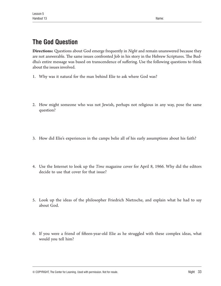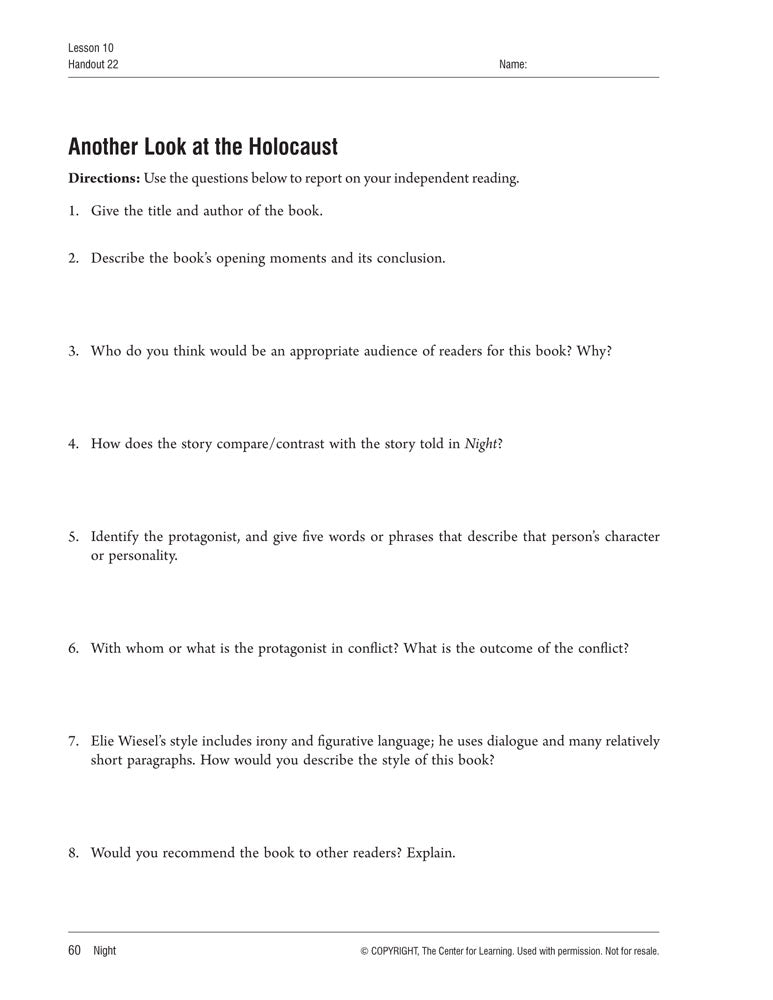 Activities include character and theme analysis. Students use the Internet to research information about the Holocaust. They focus on Wiesel’s style and how he relates historical events to the text and interprets images. Students identify figures of speech and irony. They work to understand stereotypes and scapegoats.