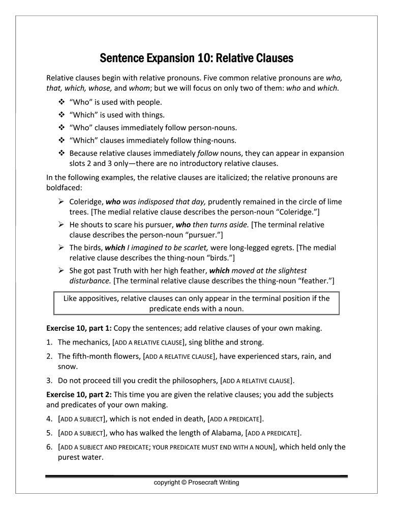 Bring your students' writing skills to the next level using lessons based on the "generative" principle of instruction. The exercises have students create the structures themselves as opposed to simply recognizing and identifying. Covers simple base sentences that students expand on by adding participial phrases, appositives, adjective phrases, absolutes, and relative clauses