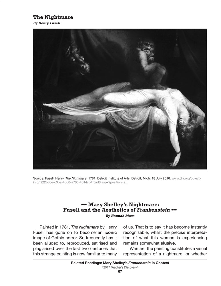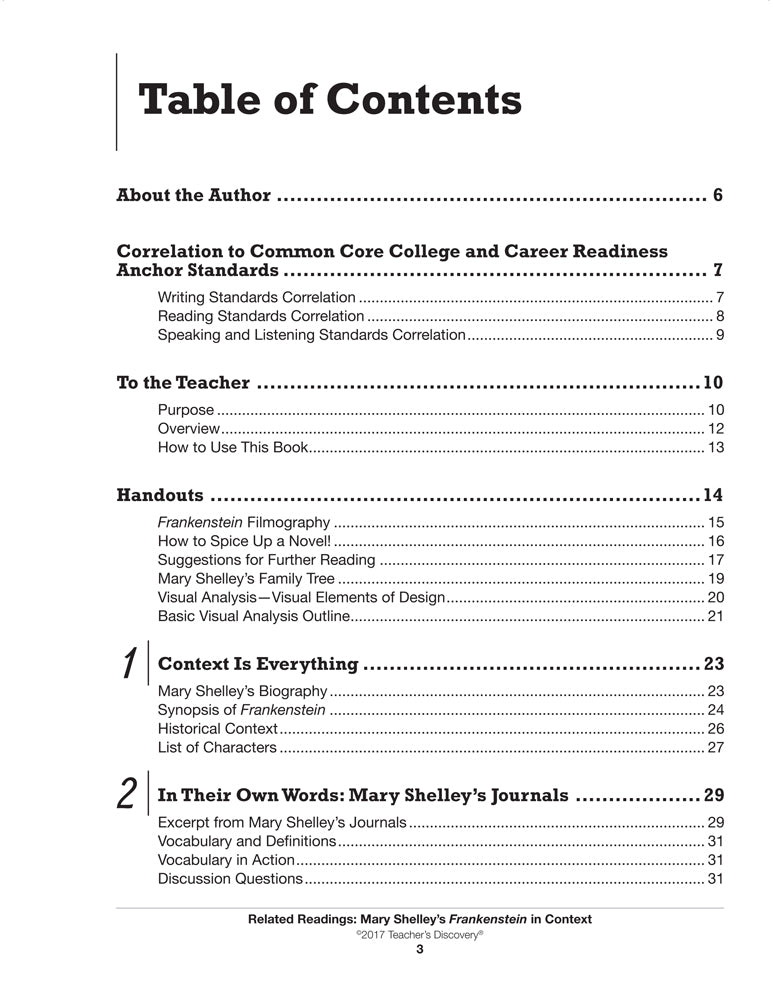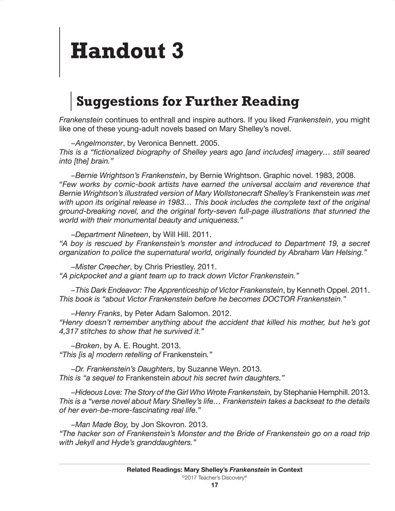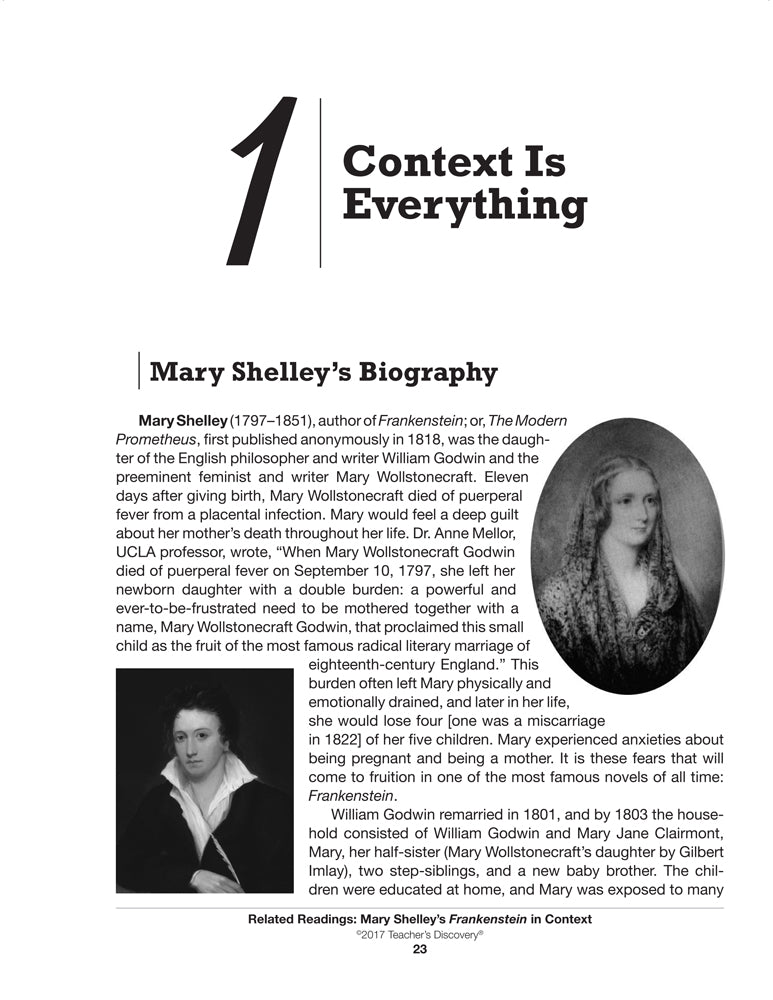 Related Readings: Mary Shelley's Frankenstein in Context features historical perspective and contemporary connections with a classic. Varied pieces examine the science and controversy surrounding the novel; poetry, artwork, and multimedia add depth and help students see the book through a wider lens.