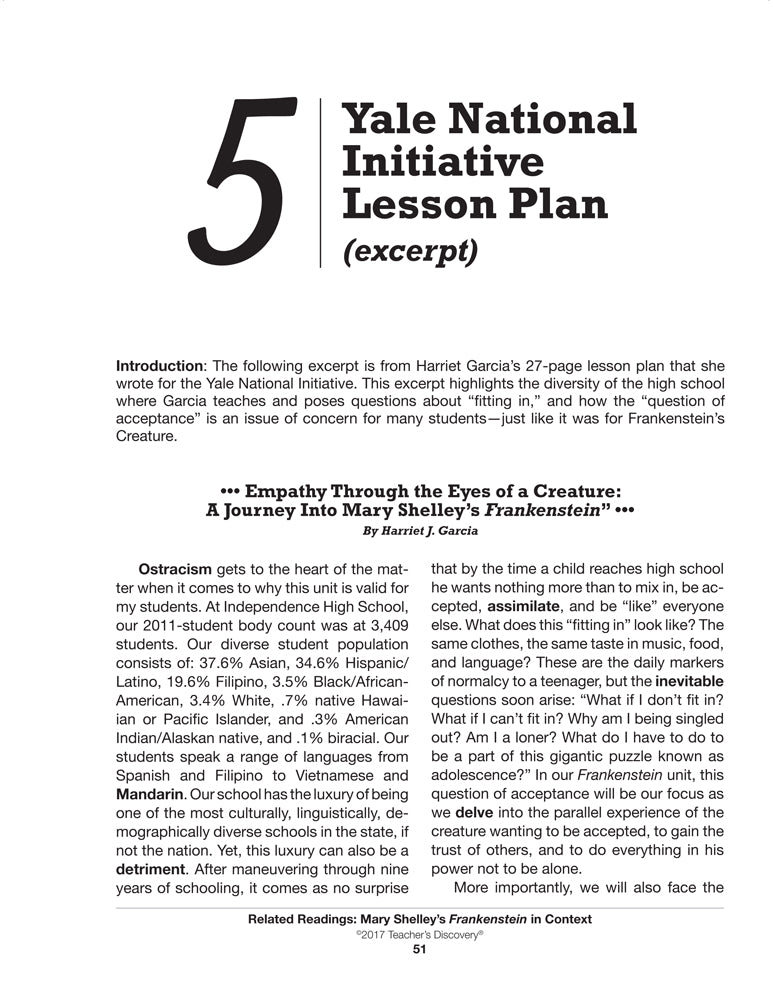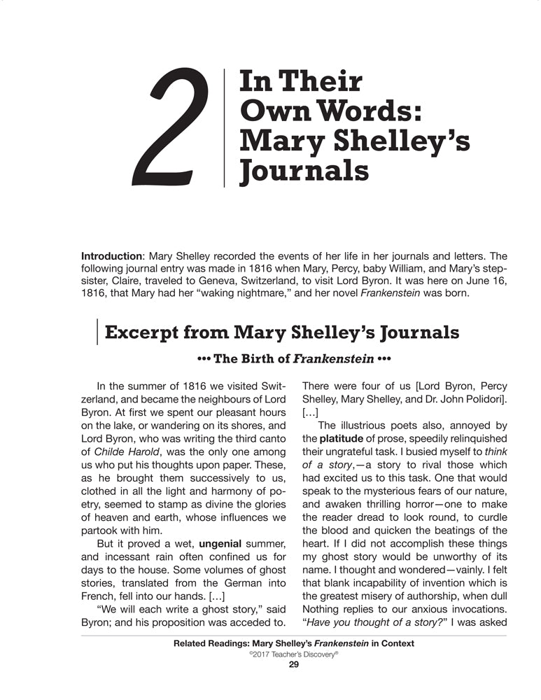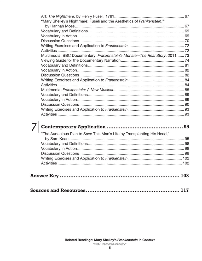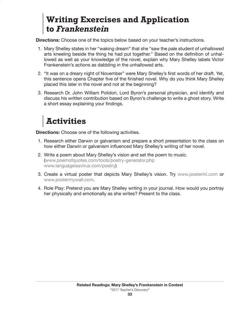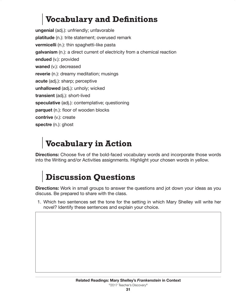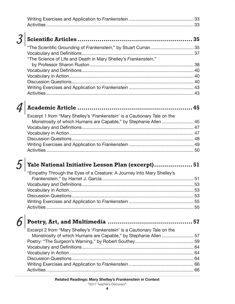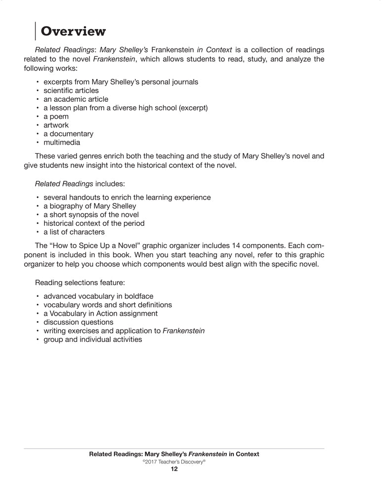 Related Readings includes an author biography, historical context, a synopsis of the novel, and a character chart. Reading selections feature support material such as selected vocabulary used in the article with definitions, a Vocabulary in Action assignment, individual and group discussion questions, writing prompts, exercises, and application to Frankenstein.