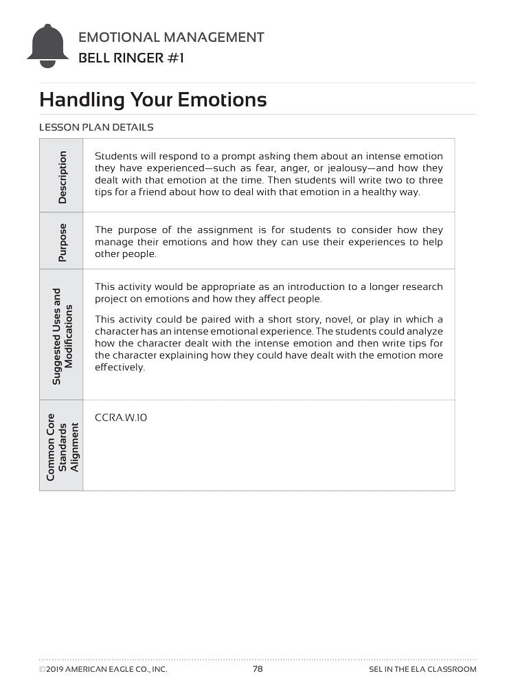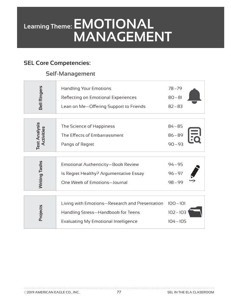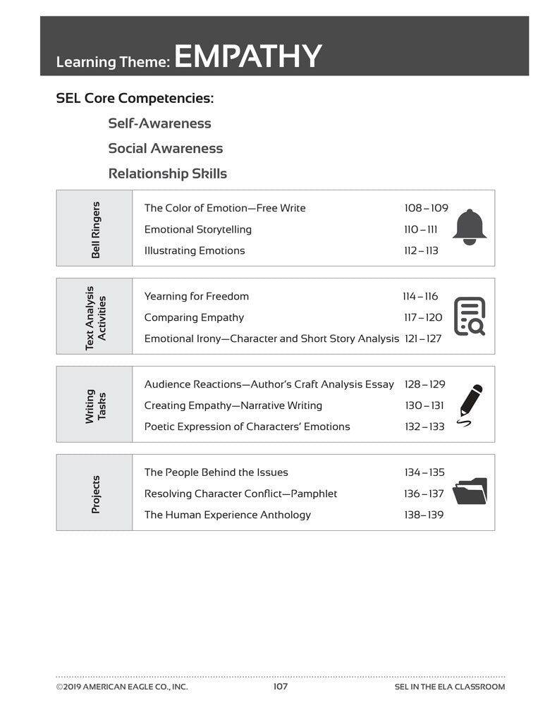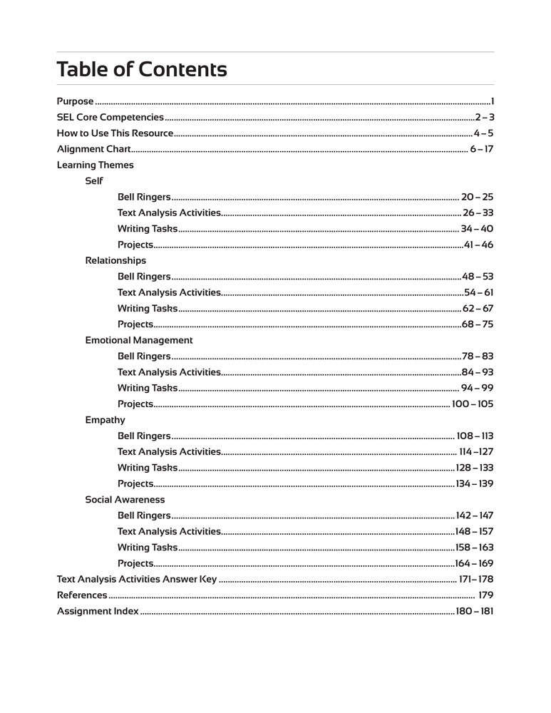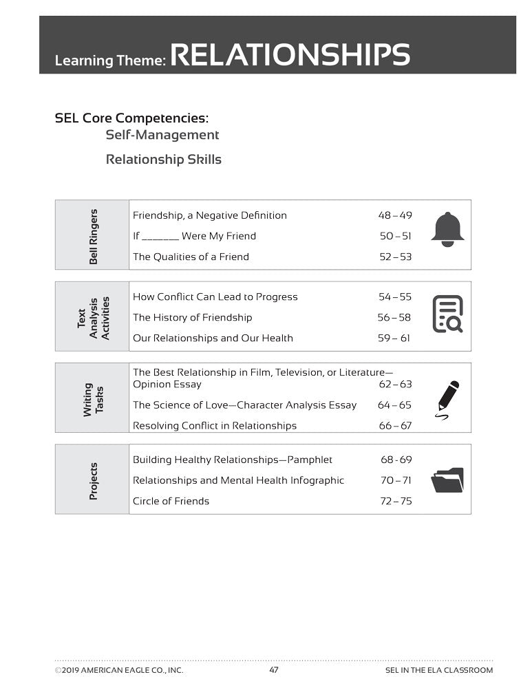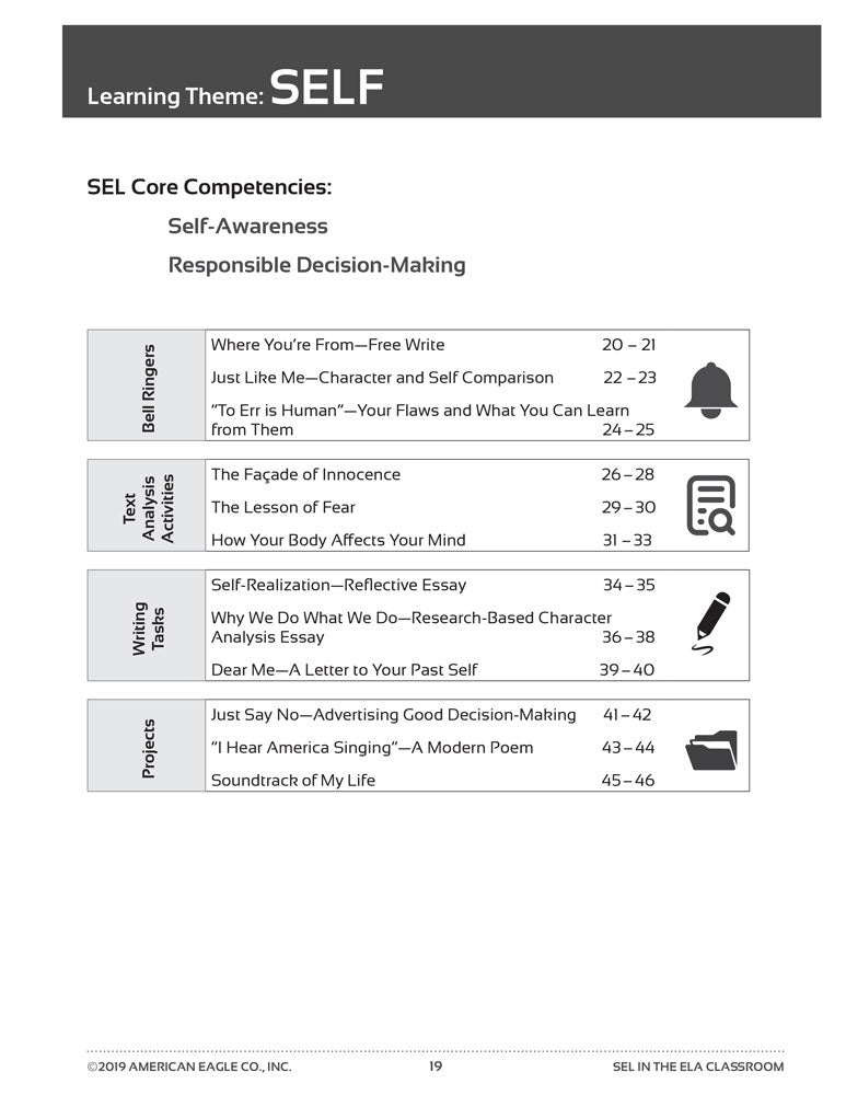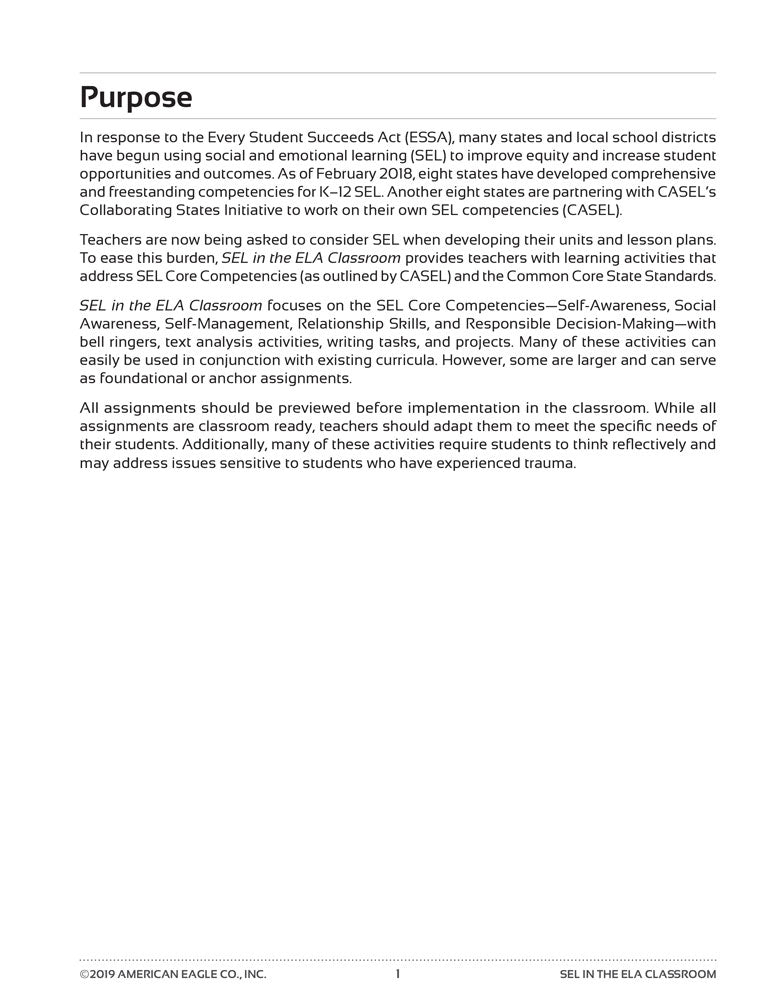 Divided into five learning themes, SEL in the ELA Classroom mirrors common literary themes and ideas addressed in novels read often in high school English classrooms. Each theme contains 12 assignments that teach SEL Core Competencies as outlined by the Collaborative for Academic, Social, and Emotional Learning (CASEL).