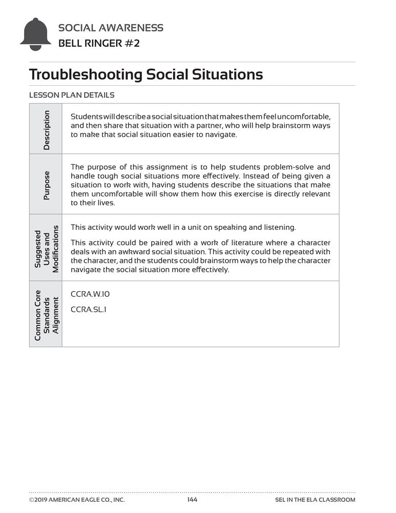 Effortlessly establish a positive classroom culture by integrating social and emotional learning into your instruction. CCSS-aligned activities can be incorporated into existing curricula or used as anchor assessments. Each assignment includes lesson plan details with a description of the activity and its purpose, as well as suggested uses and modifications.