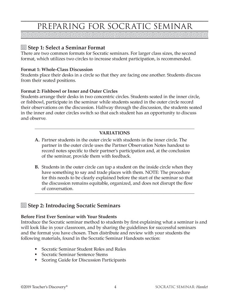The Socratic Seminar book features five seminar topics unique to the classic novel, Pre-Seminar Texts and handouts, and Guiding Questions to help students prepare for the discussion.