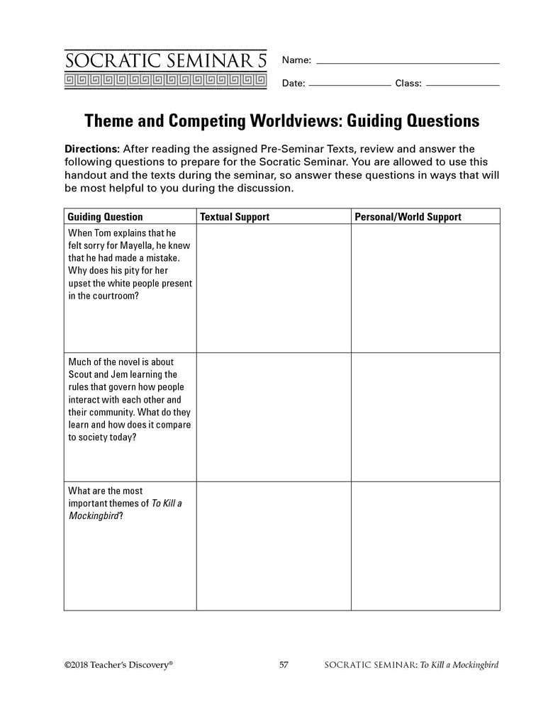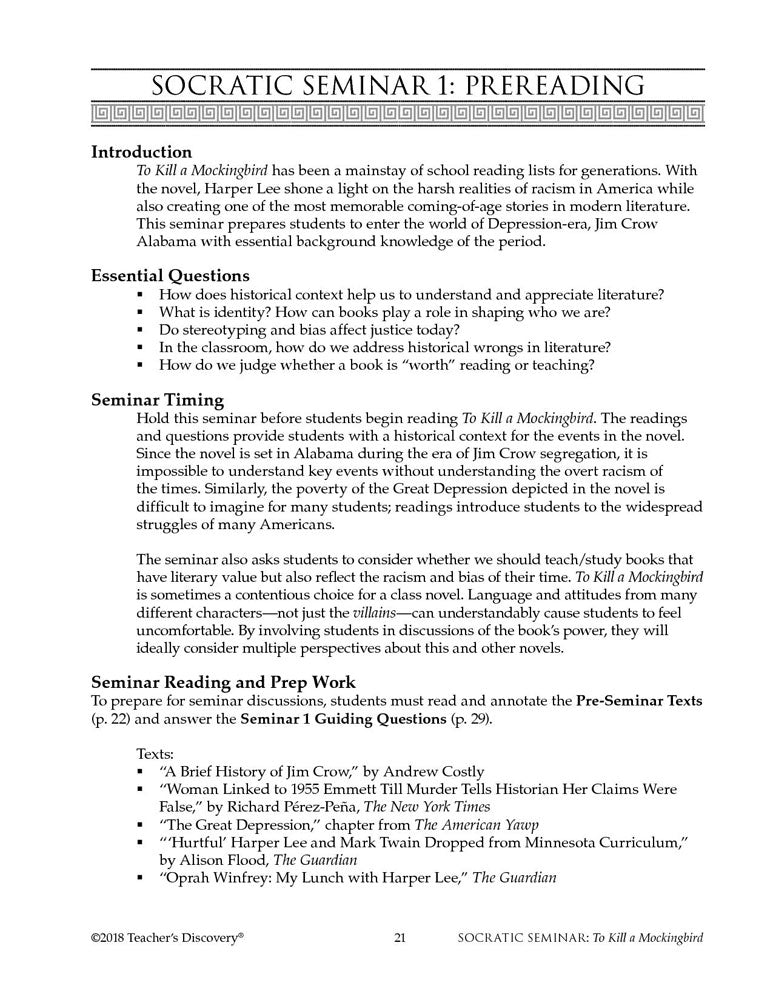 The Socratic Seminar book features five seminar topics unique to the classic novel, Pre-Seminar Texts and handouts, and Guiding Questions to help students prepare for the discussion.
