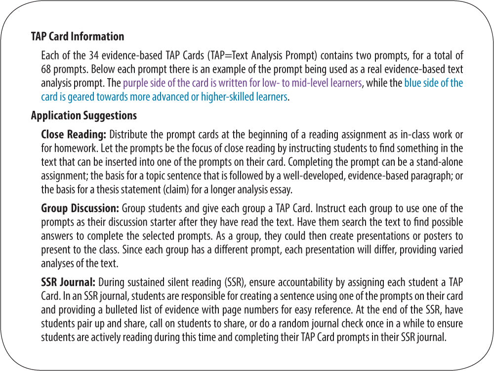 Students can no longer read passively once they are assigned evidence-based Text Analysis Prompt Cards—TAP Cards for short. The classroom application has countless possibilities because these prompts require close reading, analysis, and evidence. Each set includes 34 low- to mid-level prompts and 34 higher-level prompts—68 prompts in all.
