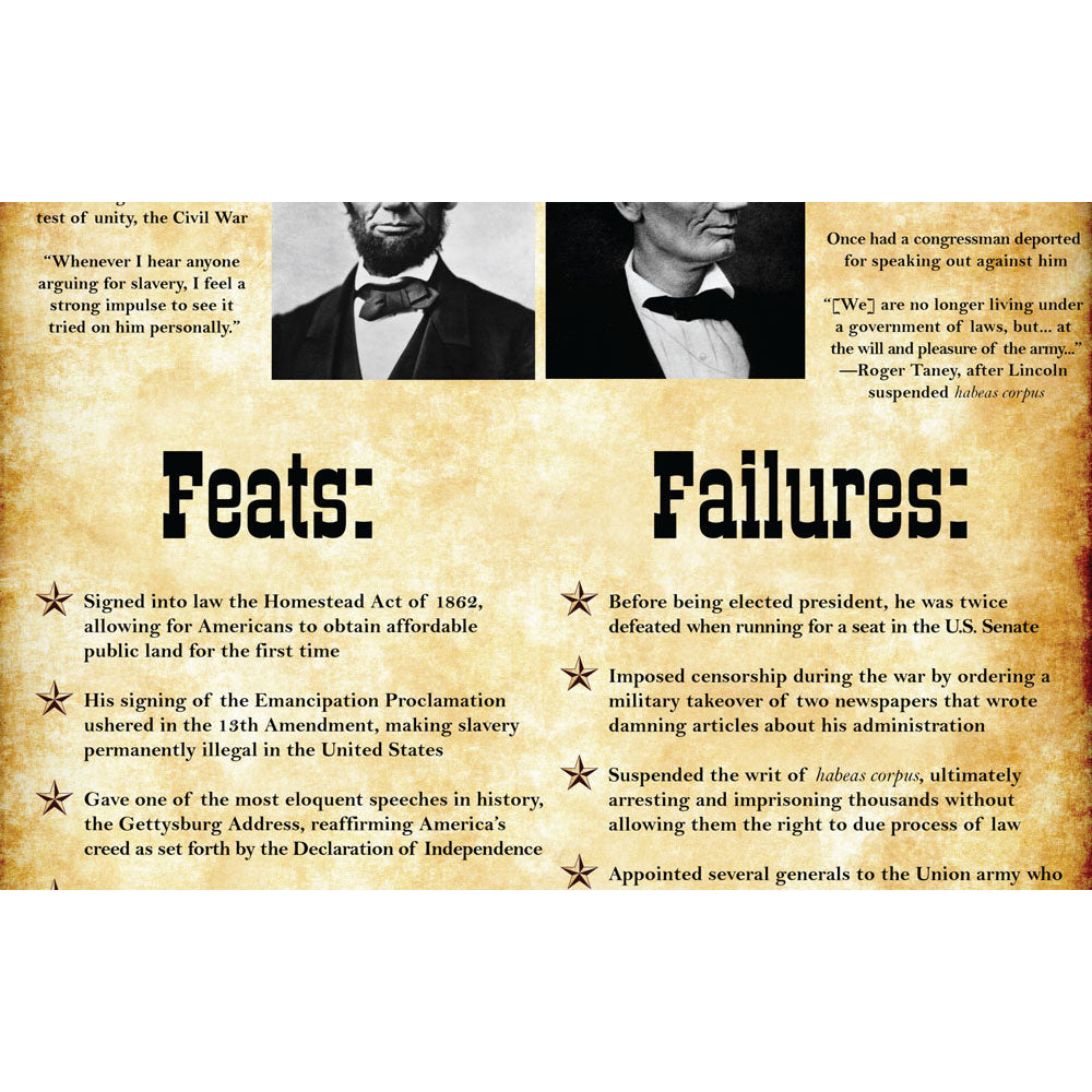 History tends to judge our past leaders as extremes: Abraham Lincoln was an American hero! Benedict Arnold was a traitor! As teachers, it’s tempting at times to present a world as black and white to our students: good or evil, friend or foe, hero or villain. Use this Abraham Lincoln mini-poster to help students take off the rose-colored glasses and see beyond the established historical narratives and into the real world of gray. ©2016. 11 x 17 inches. Cardstock.