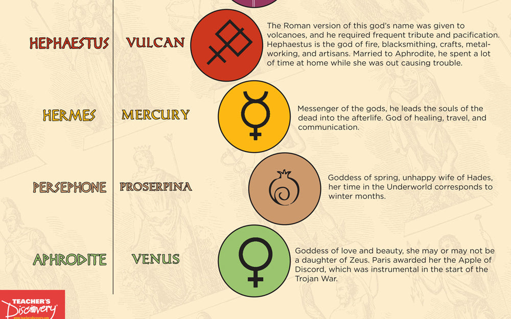 Who was the king of the gods? Are there differences between Greek and Roman names? How are the gods related to each other? Those questions and more are explained in an entertaining way that will complement your mythology lessons. Features each god's symbol in the color associated with the god, and a short "biography."