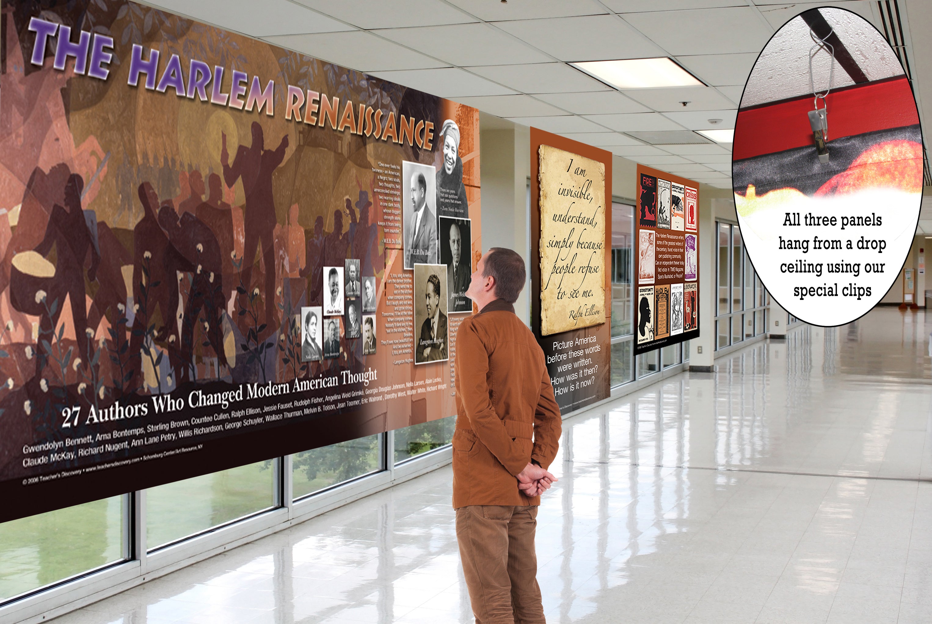 Brightly colored images on lightweight satin fabric are easy to install on any drop ceiling. Set includes "Aspects of Negro Life" by Aaron Douglas as well as poetry by Du Bois, Hughes, Hurston, and Johnson (7 feet by 17 feet), collage of magazine covers (4 feet by 4 feet), and quote from Ralph Ellison (4 feet by 8 feet).