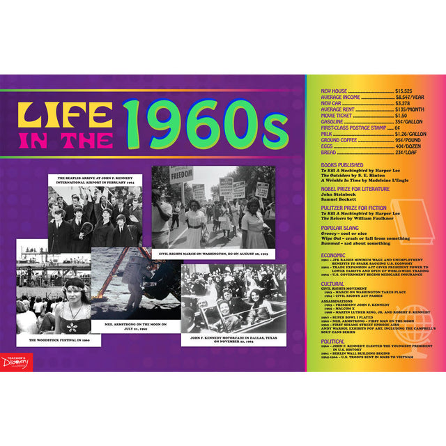 In the 1960s, you could buy a loaf of bread for 23¢ and it only cost 35¢ a gallon for gas to drive to the store! Real photos, historical events, and cost-of-living comparisons show students how generations before them lived.