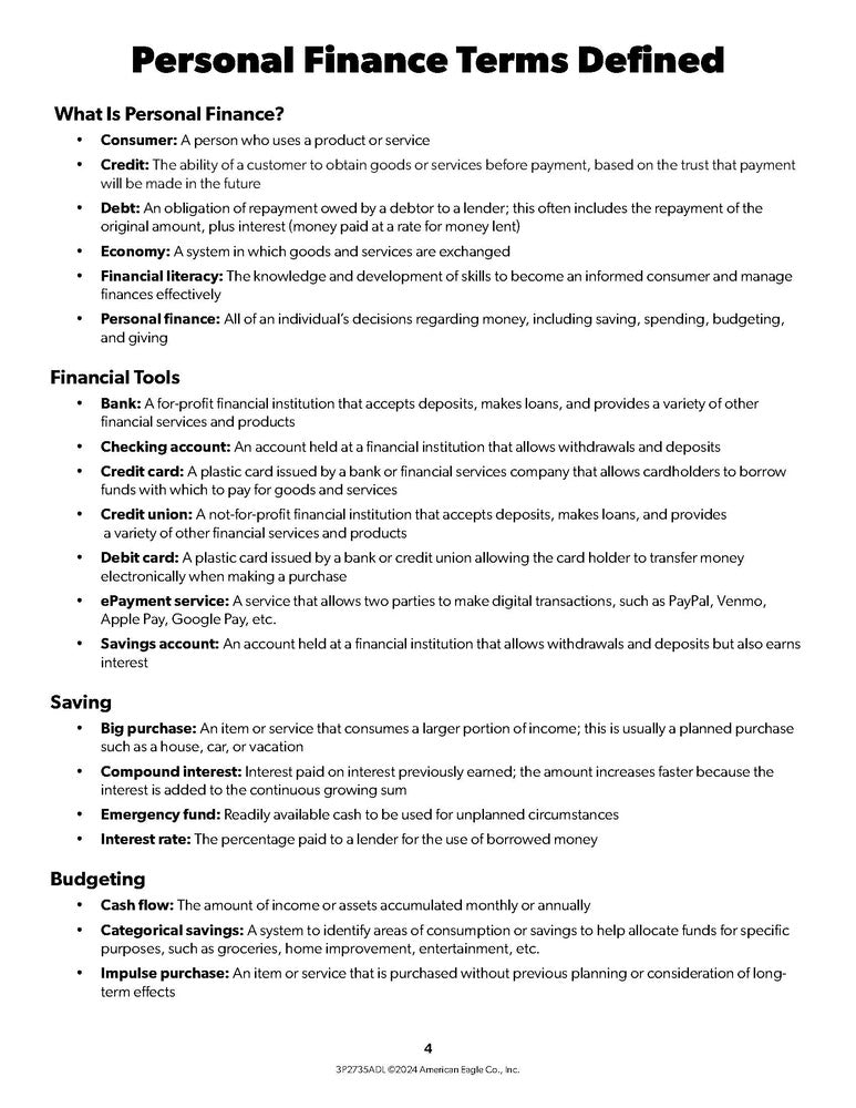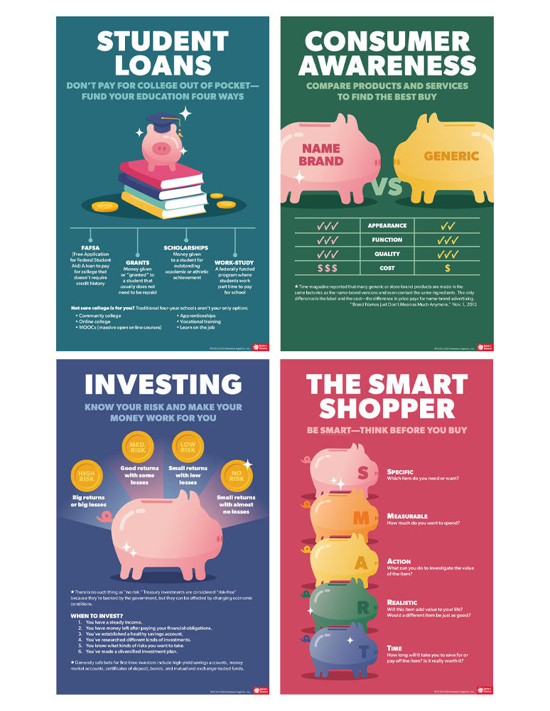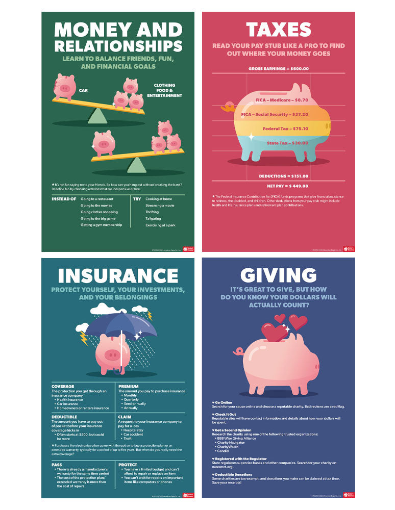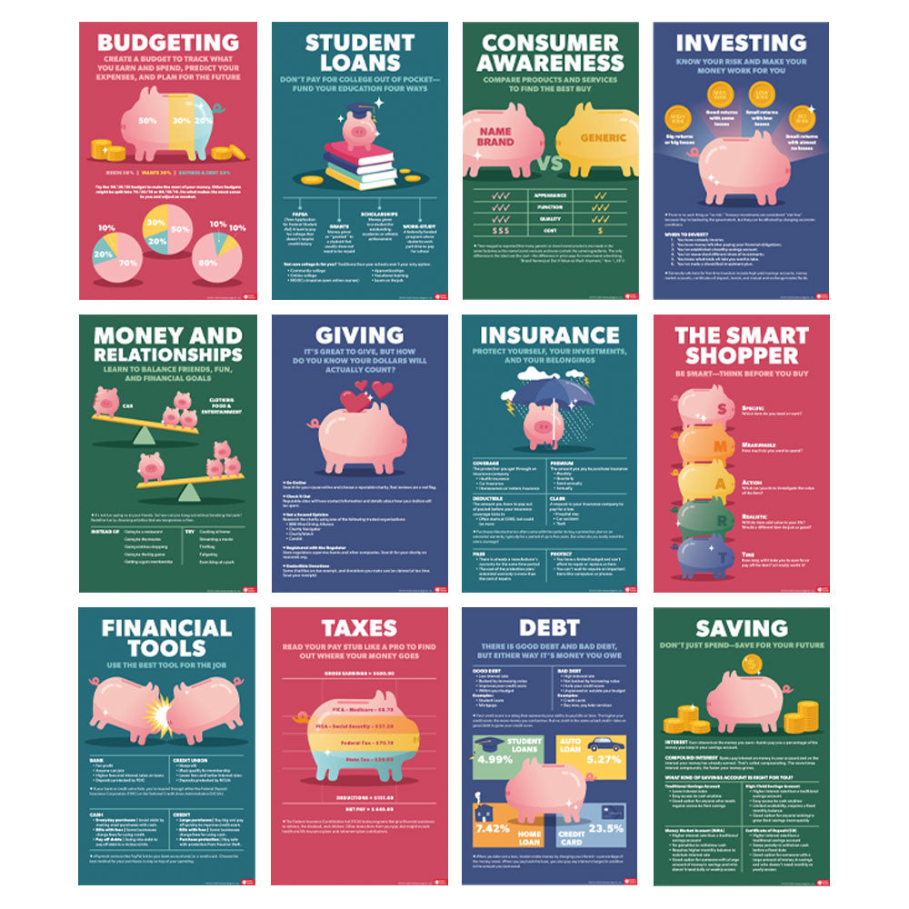 Posters: From budgeting and saving to insurance and investing, break down 12 personal finance concepts essential for success in today's world. Each poster features simple text and eye-catching visuals to explain and engage, all aligned to C3 and Common Core standards.