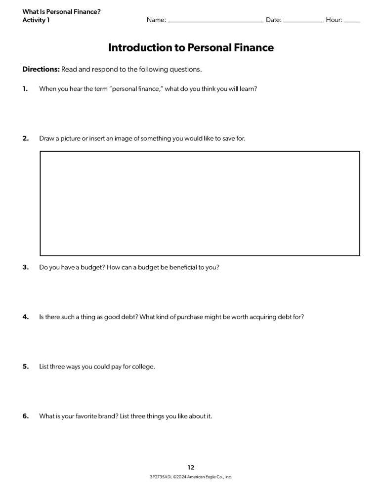 Activity Packet: Support your personal finance lessons with over 20 activities designed to help students learn valuable money management skills. Activities are aligned to C3 and Common Core standards and include vocabulary, budgeting templates, skills practice, drawing, games, and more.