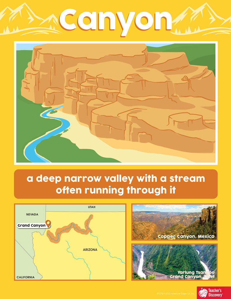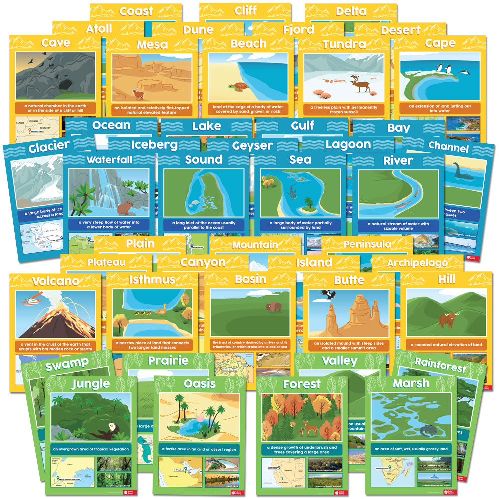 Define and demonstrate 45 key physical geography features with clear, eye-catching mini-posters. Each poster includes a term, a definition, an illustrated example, and three real-world examples.
