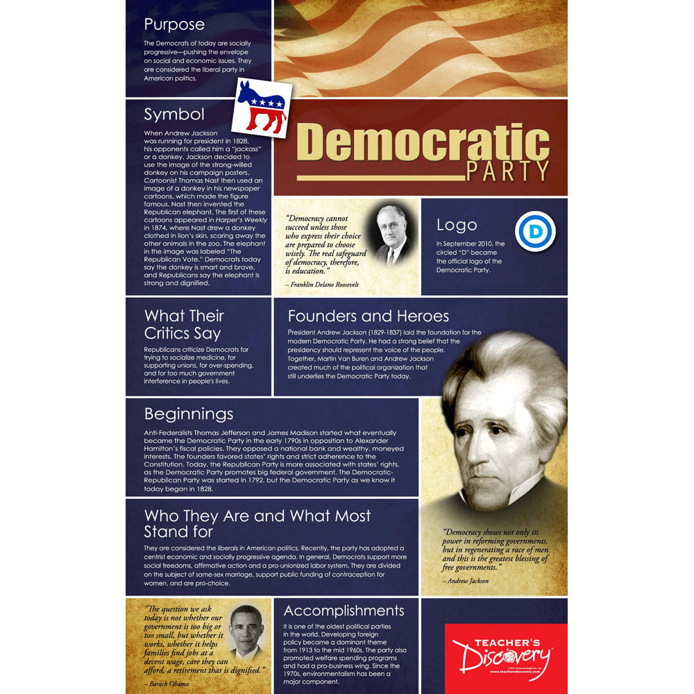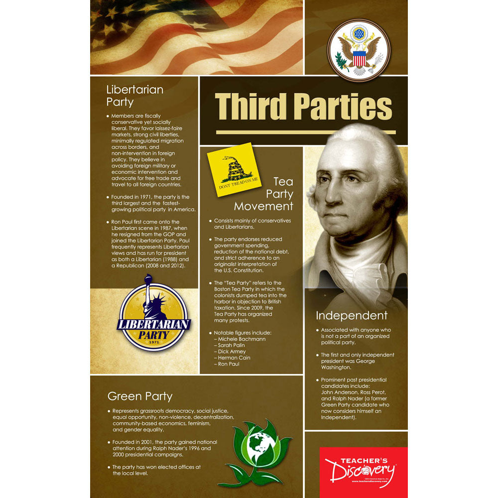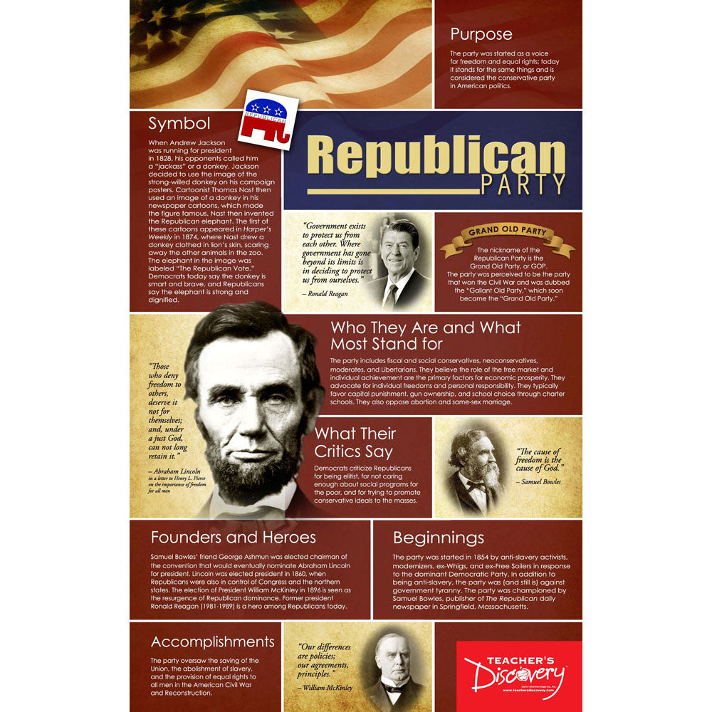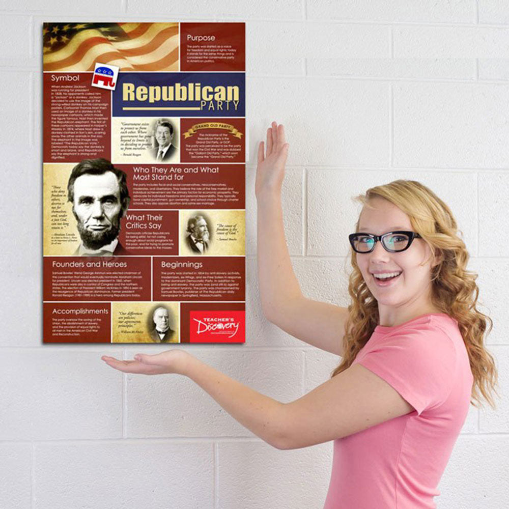 Students will gain a better understanding of the American political party system when they see the many differences and similarities between political parties. Each poster features the history and purpose of the party with examples, easy to read explanations, and bullet statements to use as a reference guide in the classroom.