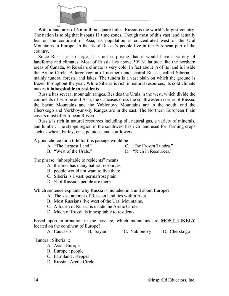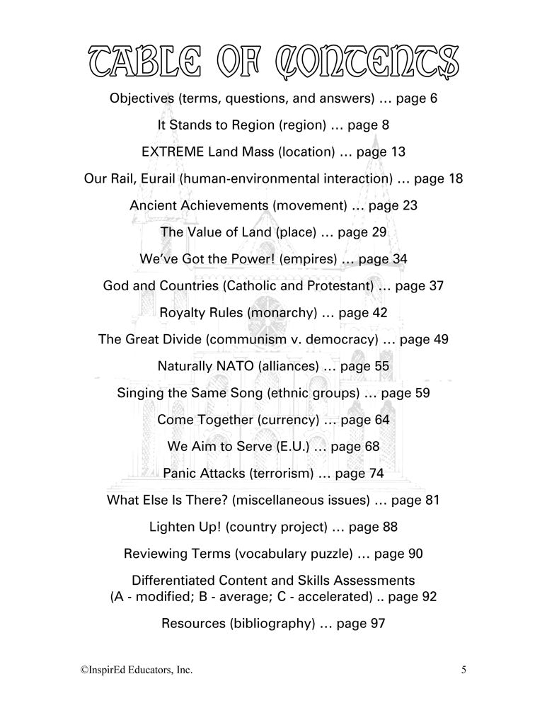 This unit examines the regions of Europe. A variety of engaging, student-centered activities examines a wide assortment of regional issues through the l lens of the five themes of geography. Unit consists of complete and easy-to-use lesson plans including a culminating research project along with study guides and differentiated tests. Like all InspirEd materials, they incorporate critical and creative thinking, test-taking skills, reading and writing in the content area, and much more!