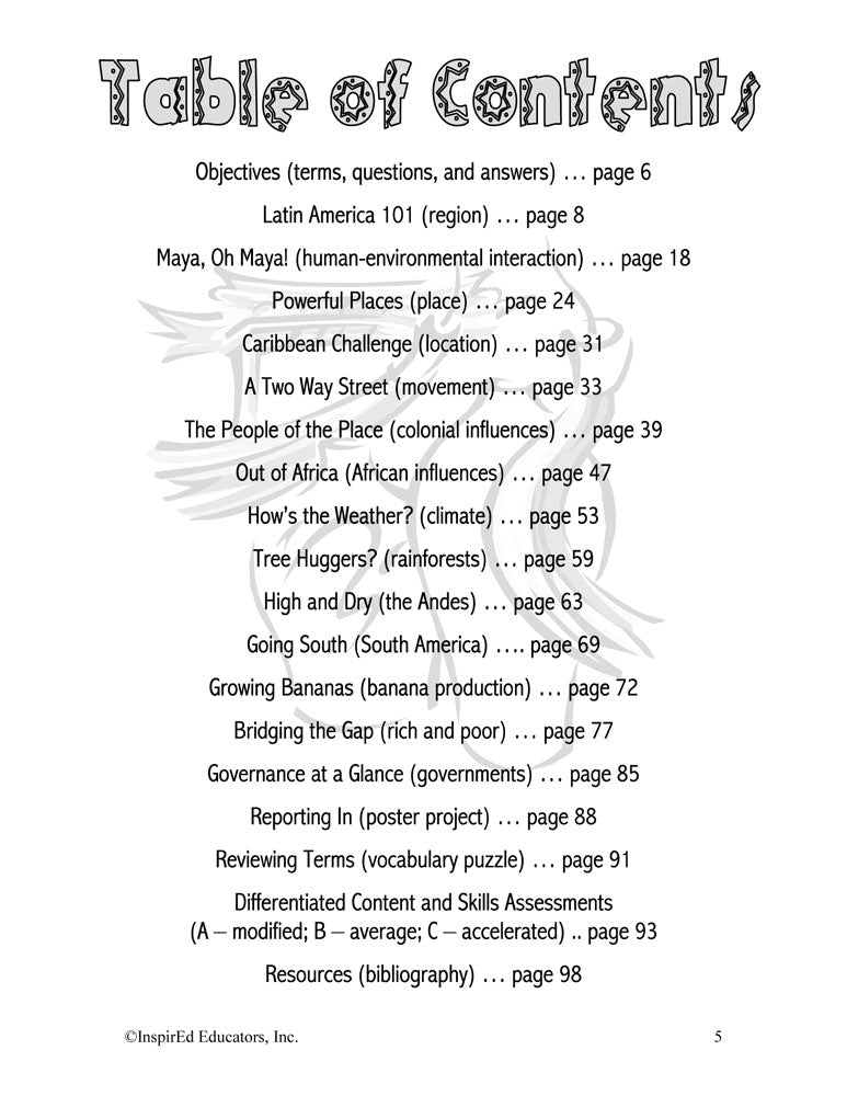 This unit examines the region of Latin America. A variety of engaging, student-centered activities examines a wide assortment of regional issues through the lens of the five themes of geography. Unit consists of complete and easy-to-use lesson plans including a culminating research project along with study guides and differentiated tests. Like all InspirEd materials, they incorporate critical and creative thinking, test-taking skills, reading and writing in the content area, and much more!