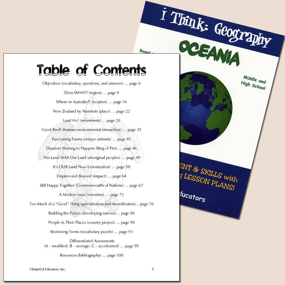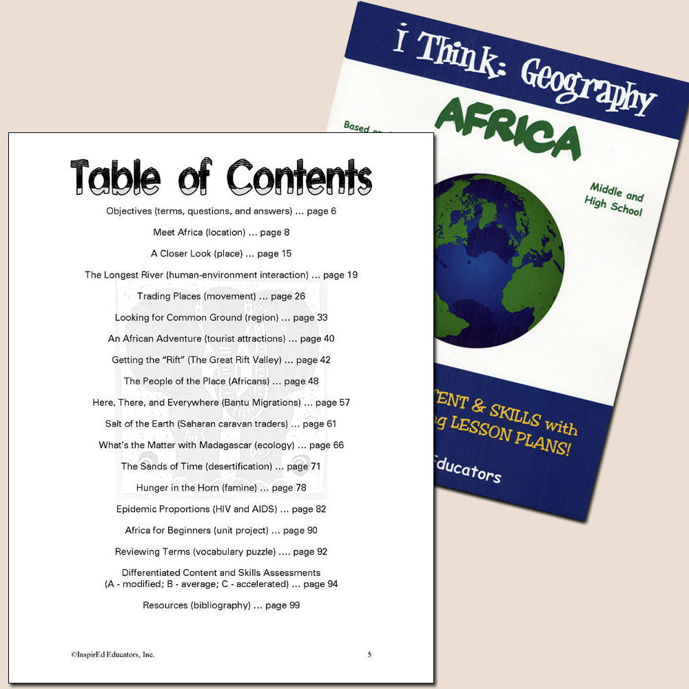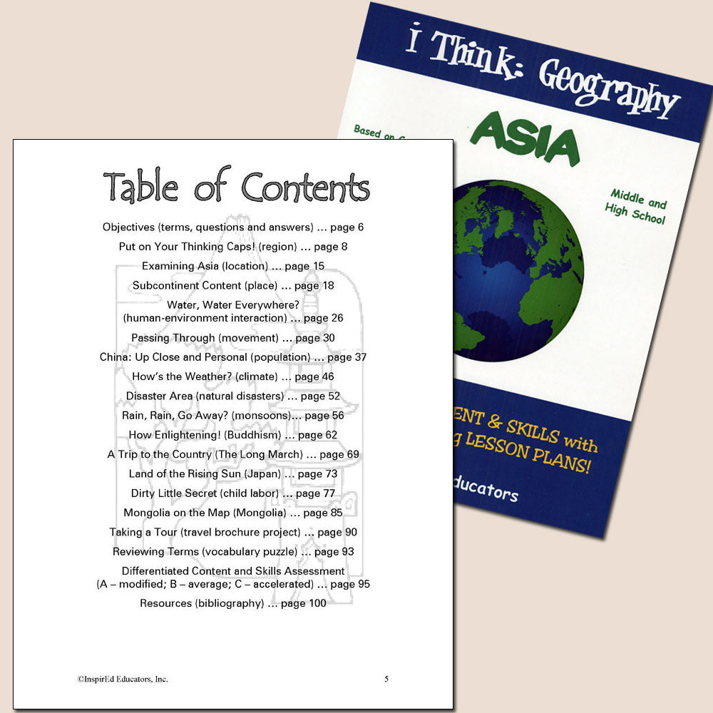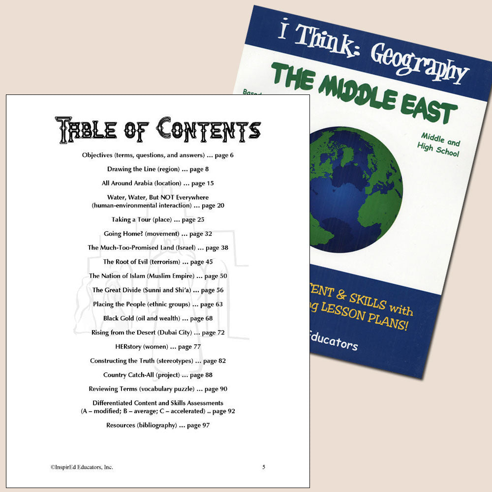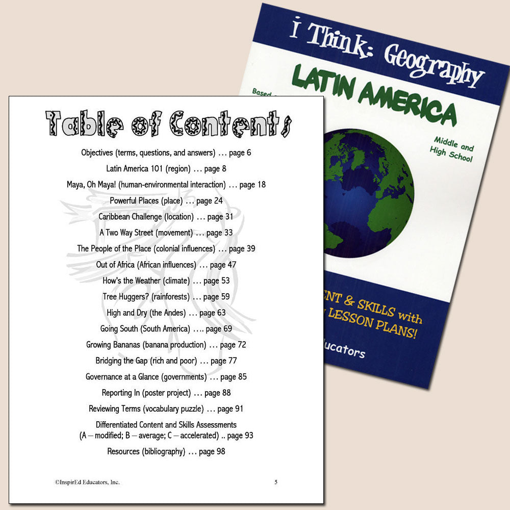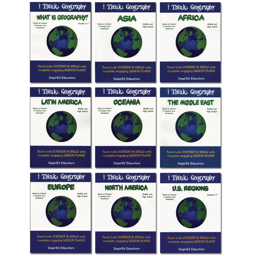 Each of these units examines one region of the world and include a variety of engaging, student-centered activities examining a wide assortment of regional issues through the lens of the five themes of geography. All consist of a minimum of 15 complete and easy-to-use lesson plans including a culminating research project along with study guides and differentiated tests. Like all InspirEd materials, they incorporate critical and creative thinking, test-taking skills, reading and writing in the content area, and much more!