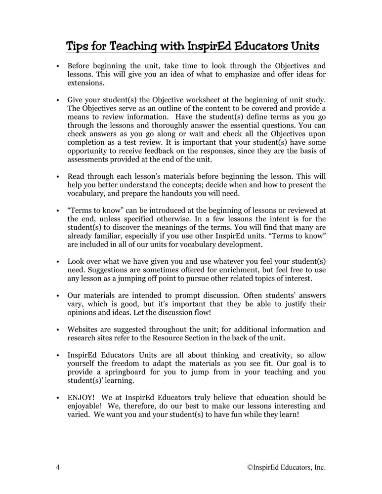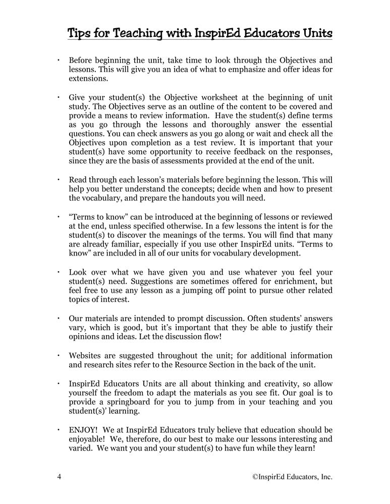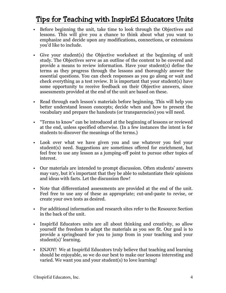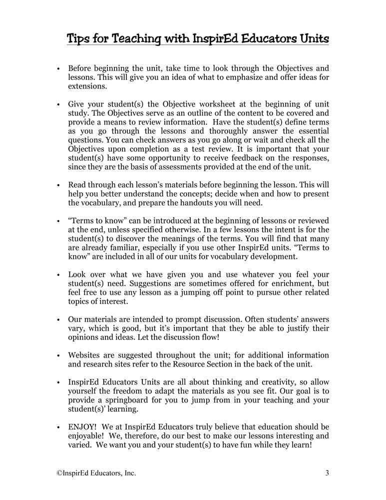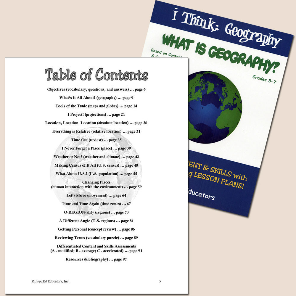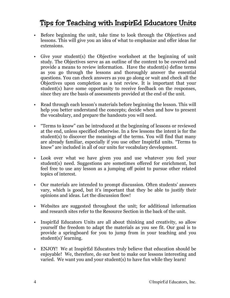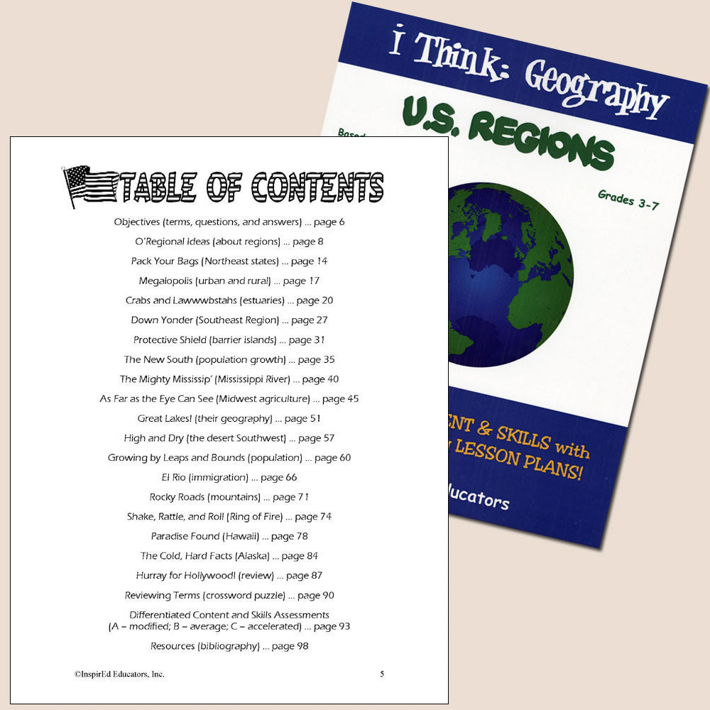 Each of these units examines one region of the world and include a variety of engaging, student-centered activities examining a wide assortment of regional issues through the lens of the five themes of geography. All consist of a minimum of 15 complete and easy-to-use lesson plans including a culminating research project along with study guides and differentiated tests. Like all InspirEd materials, they incorporate critical and creative thinking, test-taking skills, reading and writing in the content area, and much more!