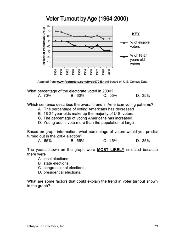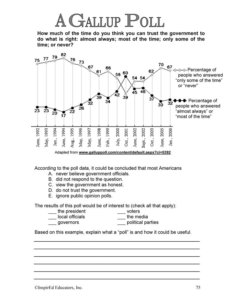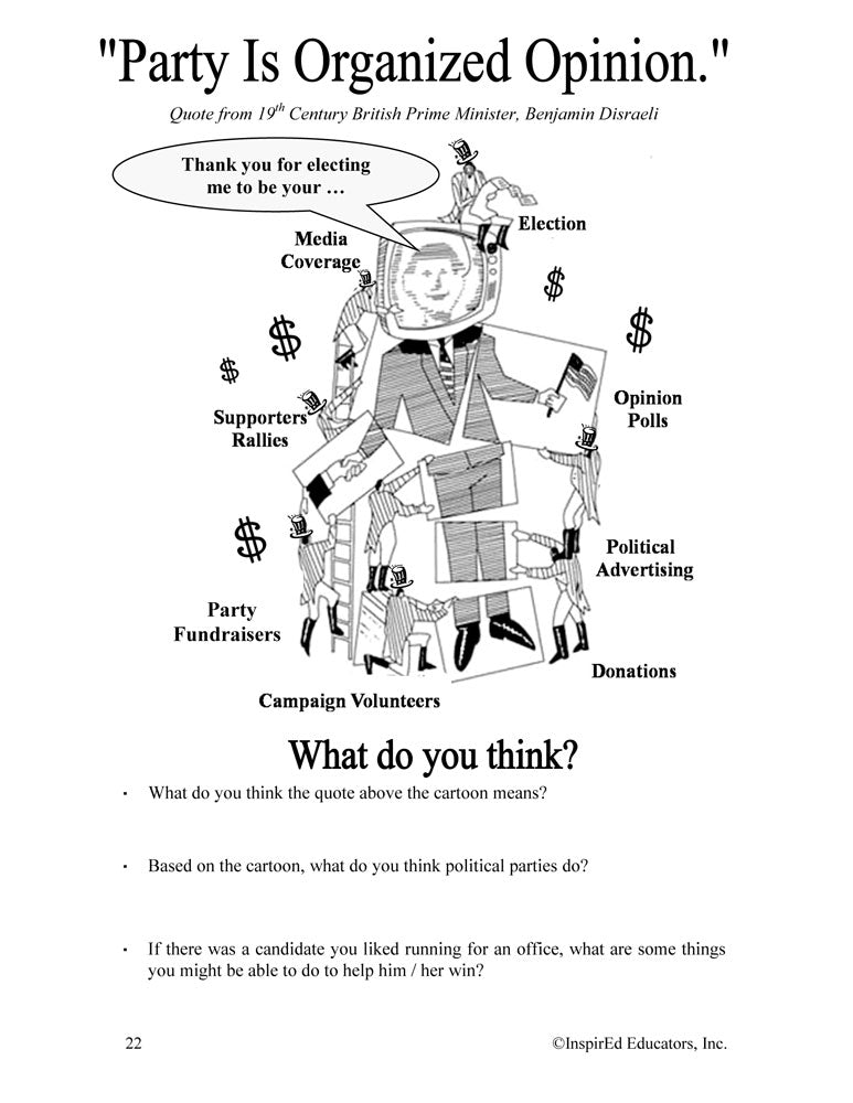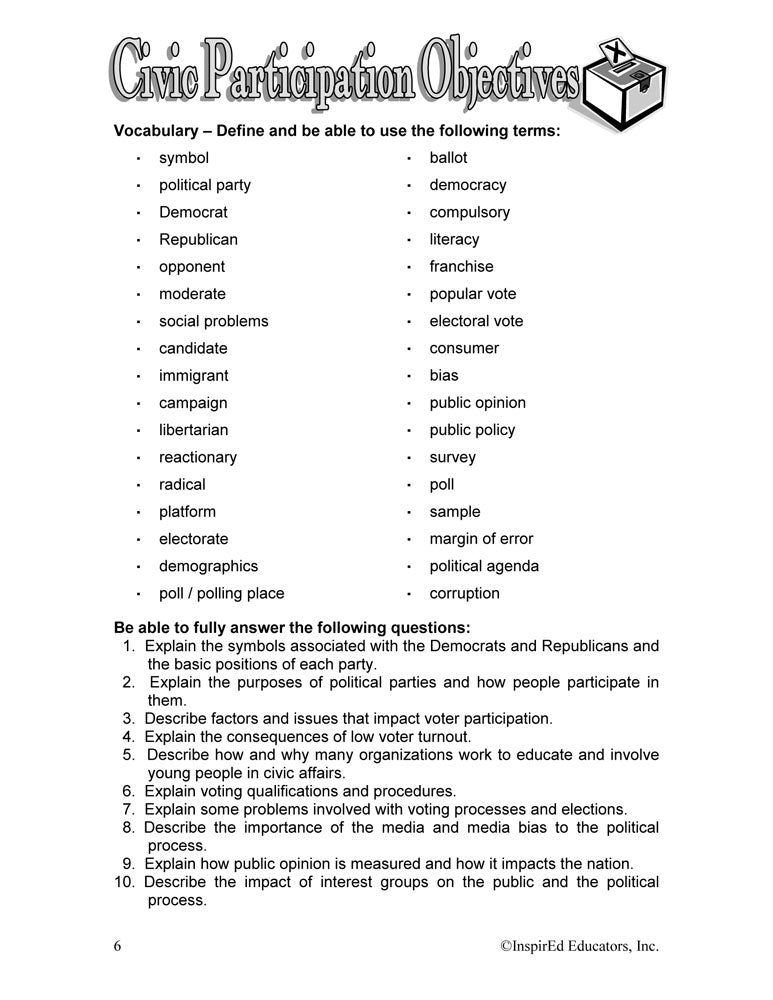 Students learn what is important to know about civic participation. Subject matter includes: the symbolism of the donkey and the elephant; what it means to be a liberal, moderate, and conservative; Democratic and Republican views; political party functions; the voting process; media influence and media bias; public opinion polls; lobbying; and much more.