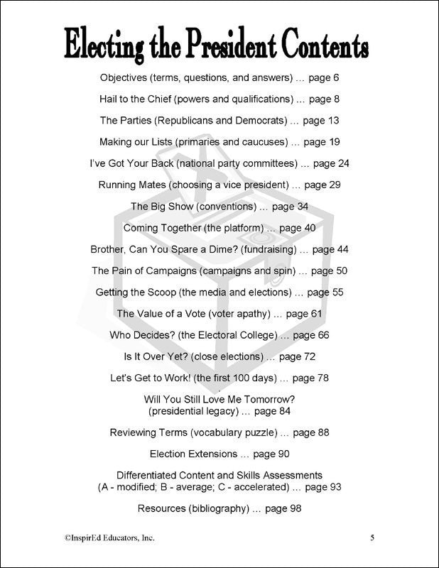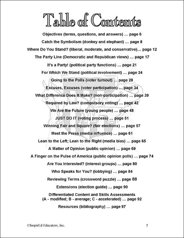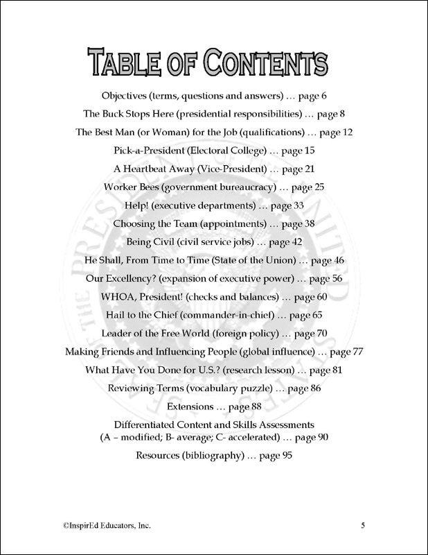 Students discover a variety of fascinating facts about the United States government. Each unit features a variety of engaging, student-centered activities and lesson plans examine government. These units consist of complete and easy-to-use lesson plans along with study guides and differentiated tests. Like all InspirEd materials, they incorporate critical and creative thinking, test-taking skills, reading and writing in the content area, and much more!