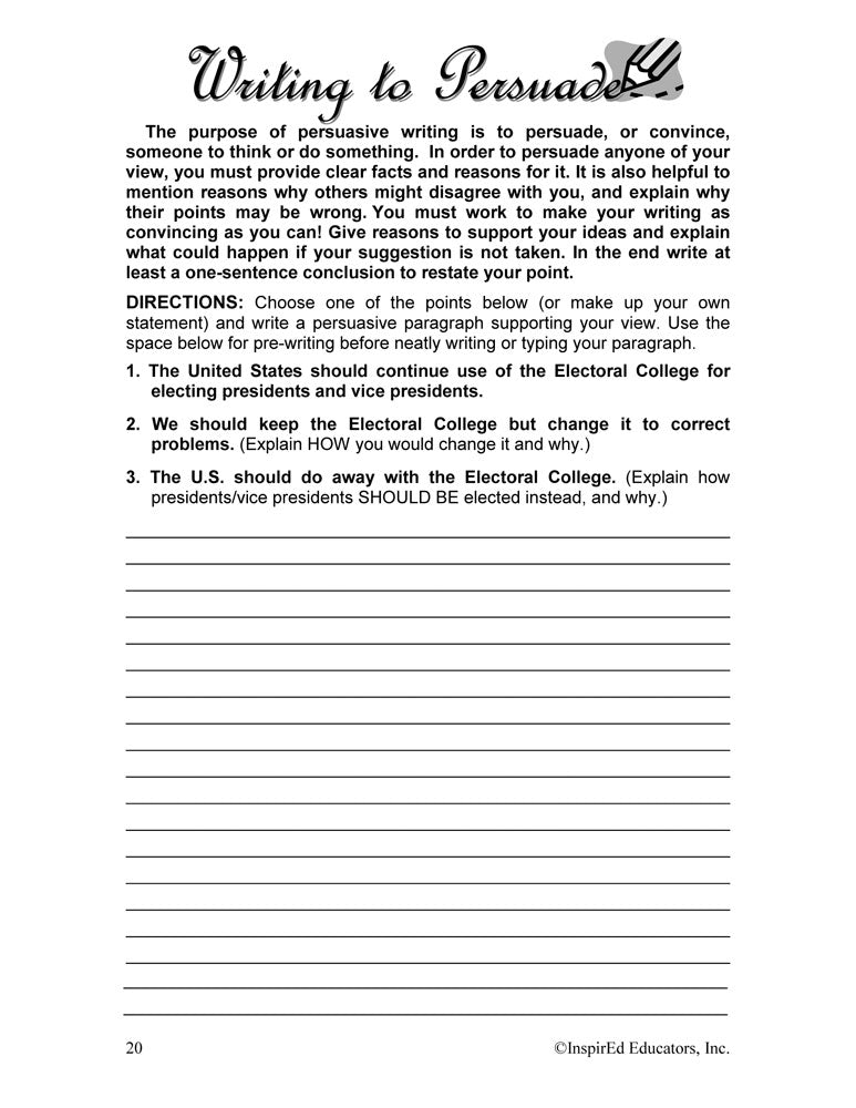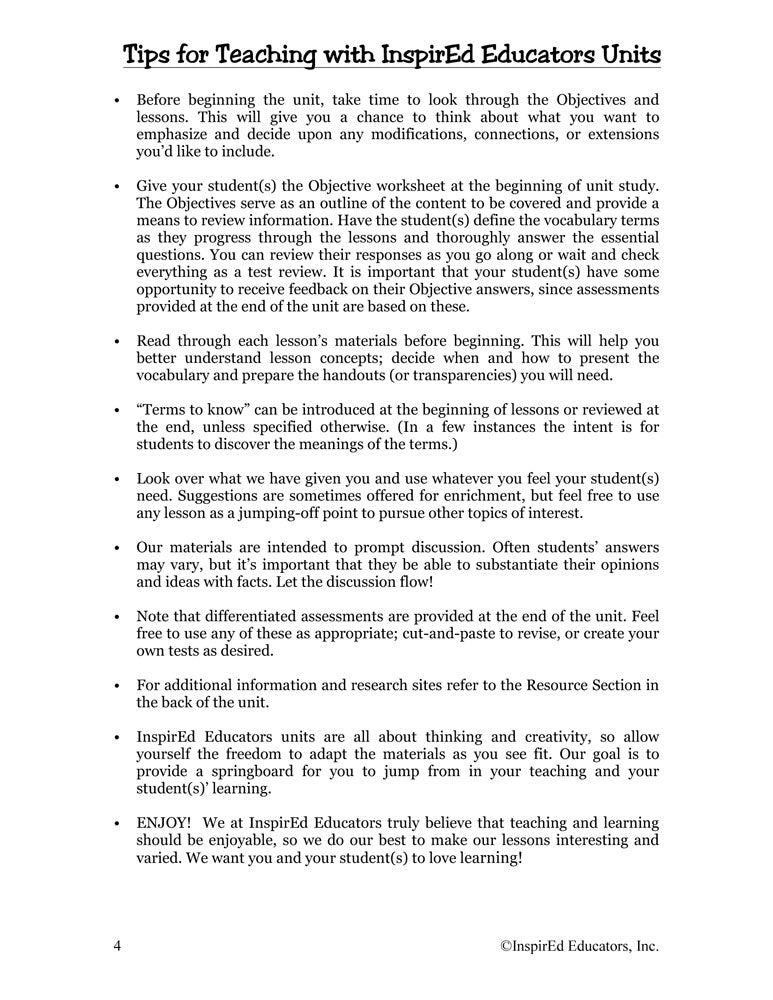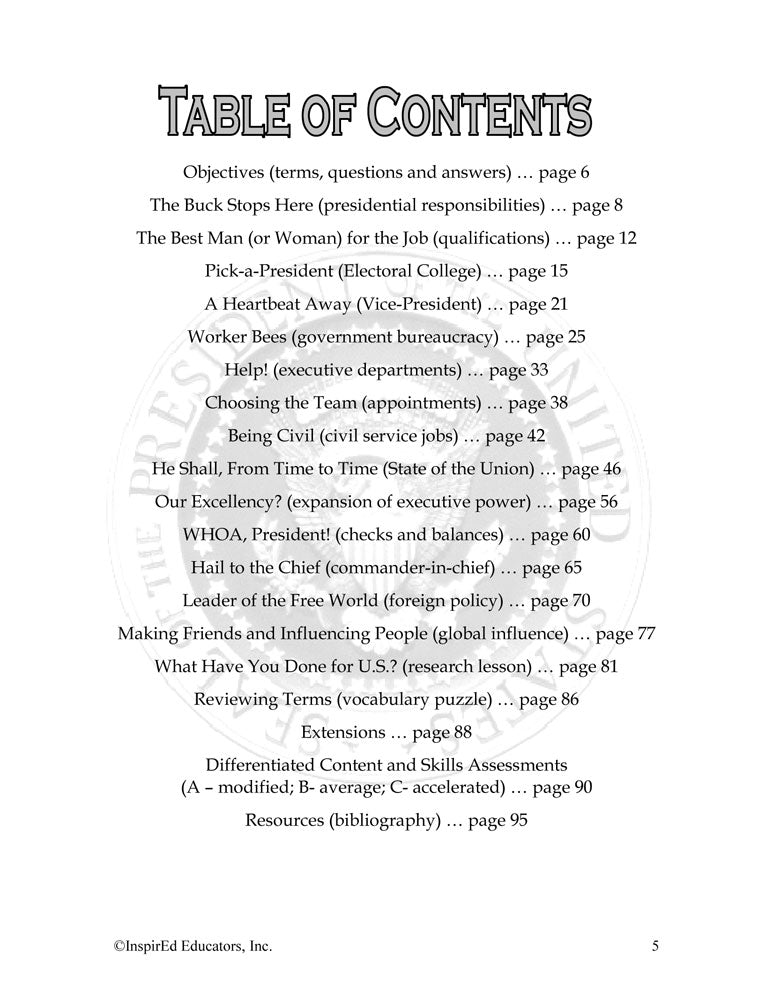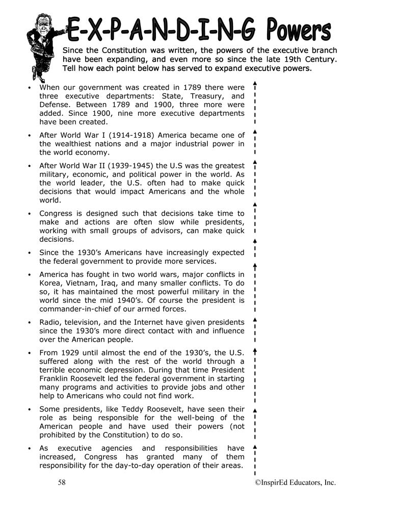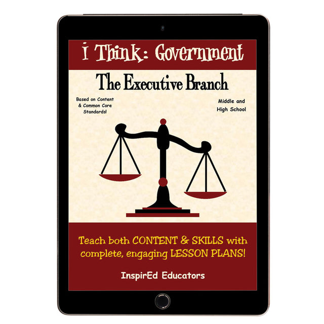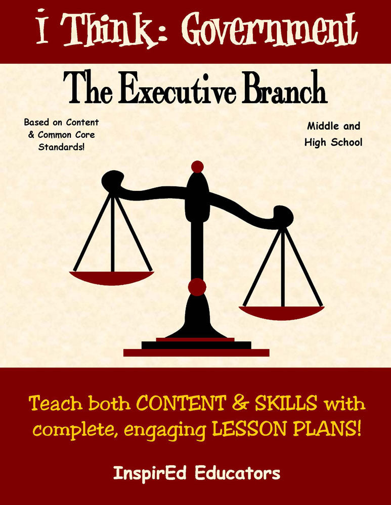 A variety of engaging, student-centered activities and lesson plans examine the U.S. Executive Branch. This unit consists of complete and easy-to-use lesson plans along with study guides and differentiated tests. Like all InspirEd materials, they incorporate critical and creative thinking, test-taking skills, reading and writing in the content area, and much more!