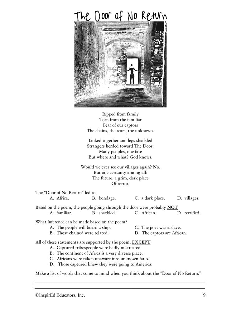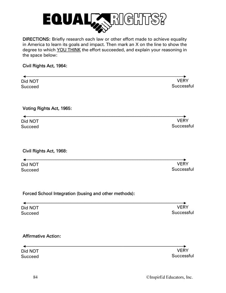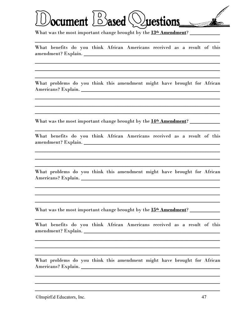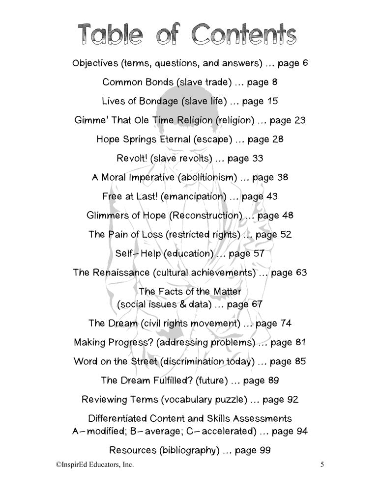 The activities in this book cover the following topics: slave trade, slave life, religion, escape, abolitionism, emancipation, Reconstruction, restricted rights, education, cultural achievements, social issues, the civil rights movement, and discrimination today.