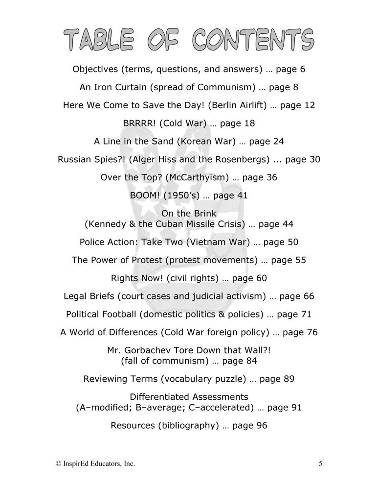 This activity and lesson plan book covers topics such as: Communism, the Korean War, McCarthyism, the Vietnam War, civil rights, and more.