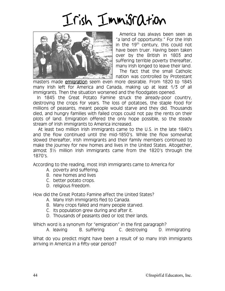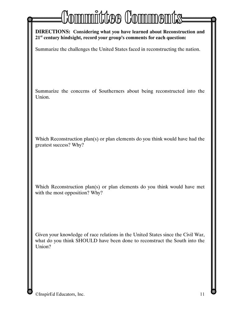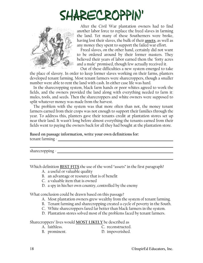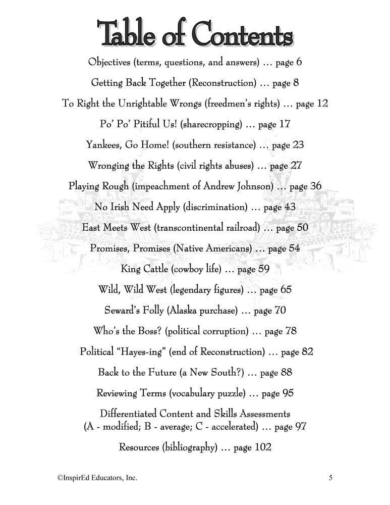A variety of engaging, student-centered activities and lesson plans examine the U.S. Reconstruction Era. This unit consists of complete and easy-to-use lesson plans along with study guides and differentiated tests. Like all InspirEd materials, they incorporate critical and creative thinking, test-taking skills, reading and writing in the content area, and much more!