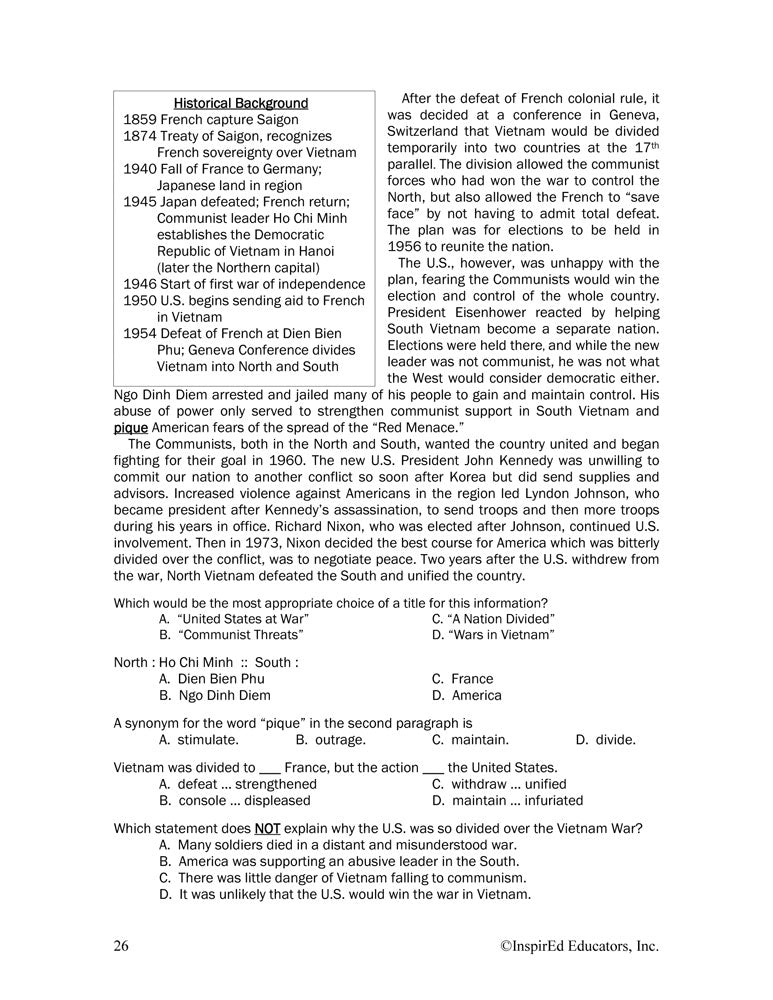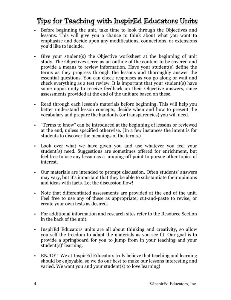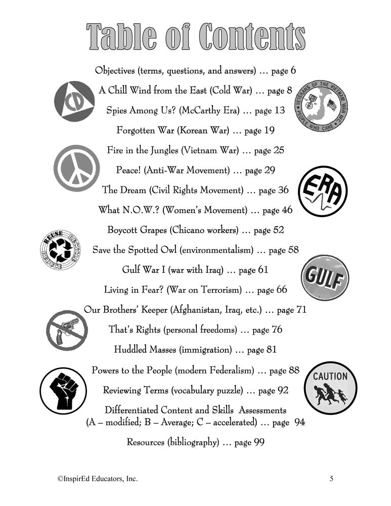 Students learn an array of interesting facts about the U.S. Modern Era. Subject matter includes the Cold War, the anti-war movement, the civil rights movement, the women's movement, environmentalism, the Gulf War, the war on terrorism, and much more. This unit consists of complete and easy-to-use lesson plans along with study guides and differentiated tests. Like all InspirEd materials, they incorporate critical and creative thinking, test-taking skills, reading and writing in the content area, and much more!