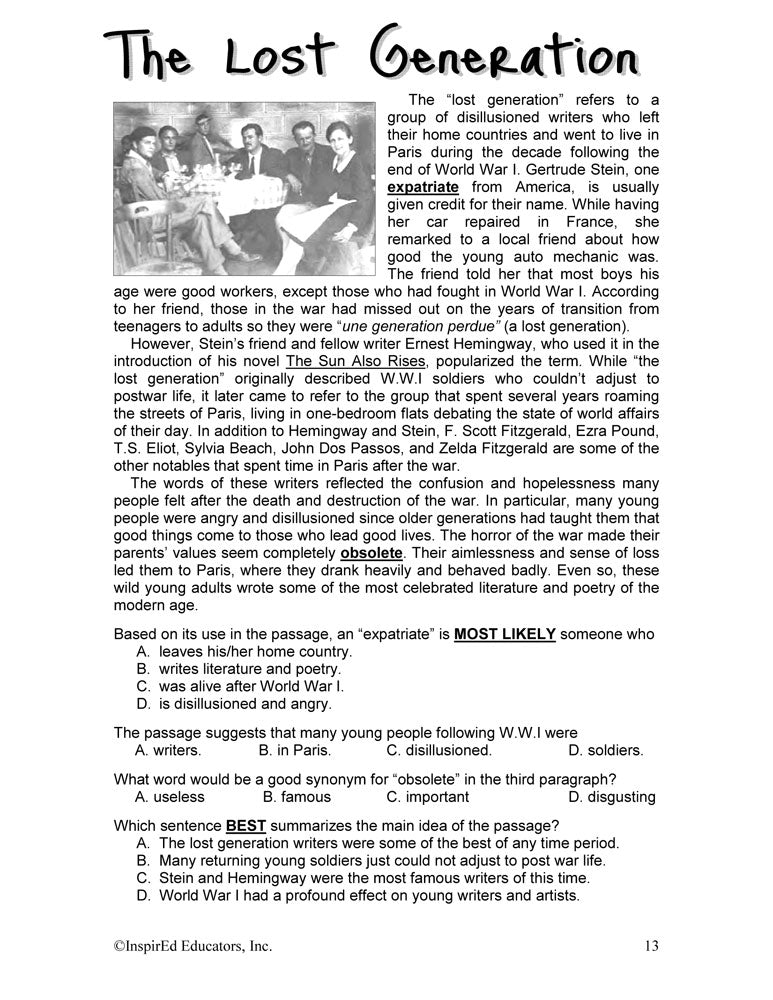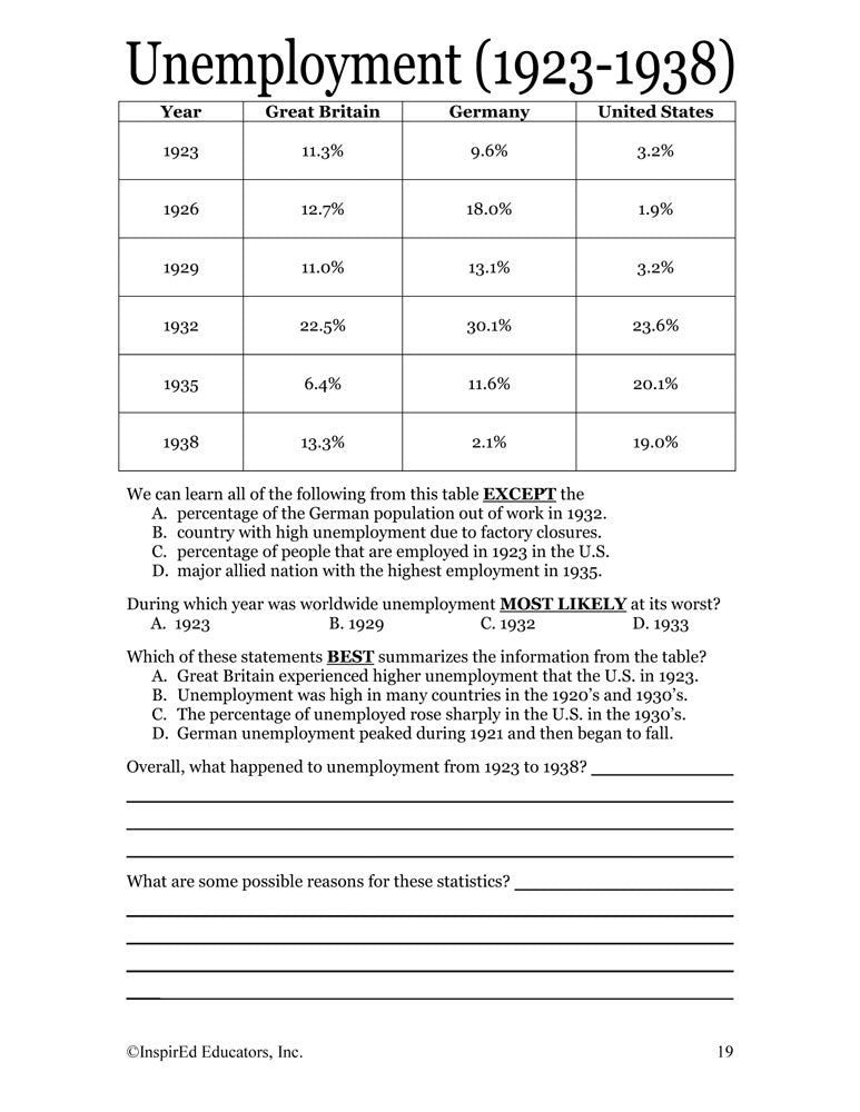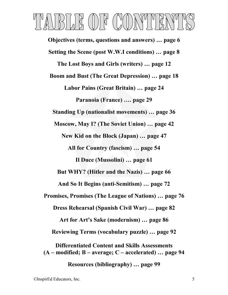 Students learn an array of interesting facts about the world following World War I. Subject matter includes the Great Depression, nationalist movements, fascism, anti-Semitism, the League of Nations, the Spanish Civil War, and more. This unit consists of complete and easy-to-use lesson plans along with study guides and differentiated tests. Like all InspirEd materials, they incorporate critical and creative thinking, test-taking skills, reading and writing in the content area, and much more!