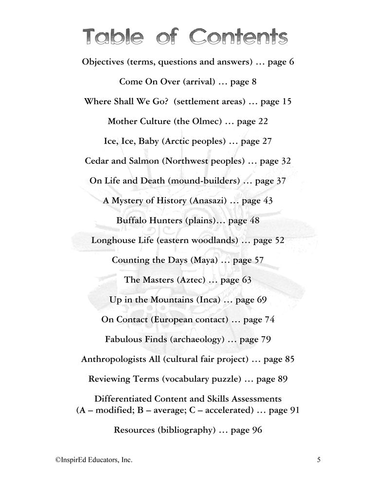 Topics in this activity book include: settlement areas, mound builders, plains, Maya, Aztec, Inca, and more.