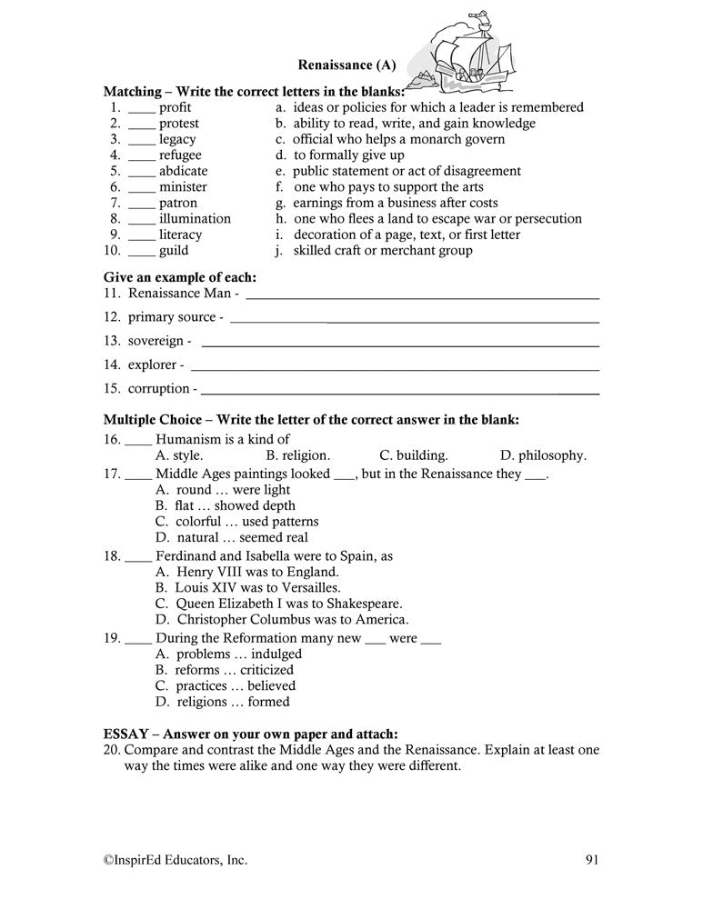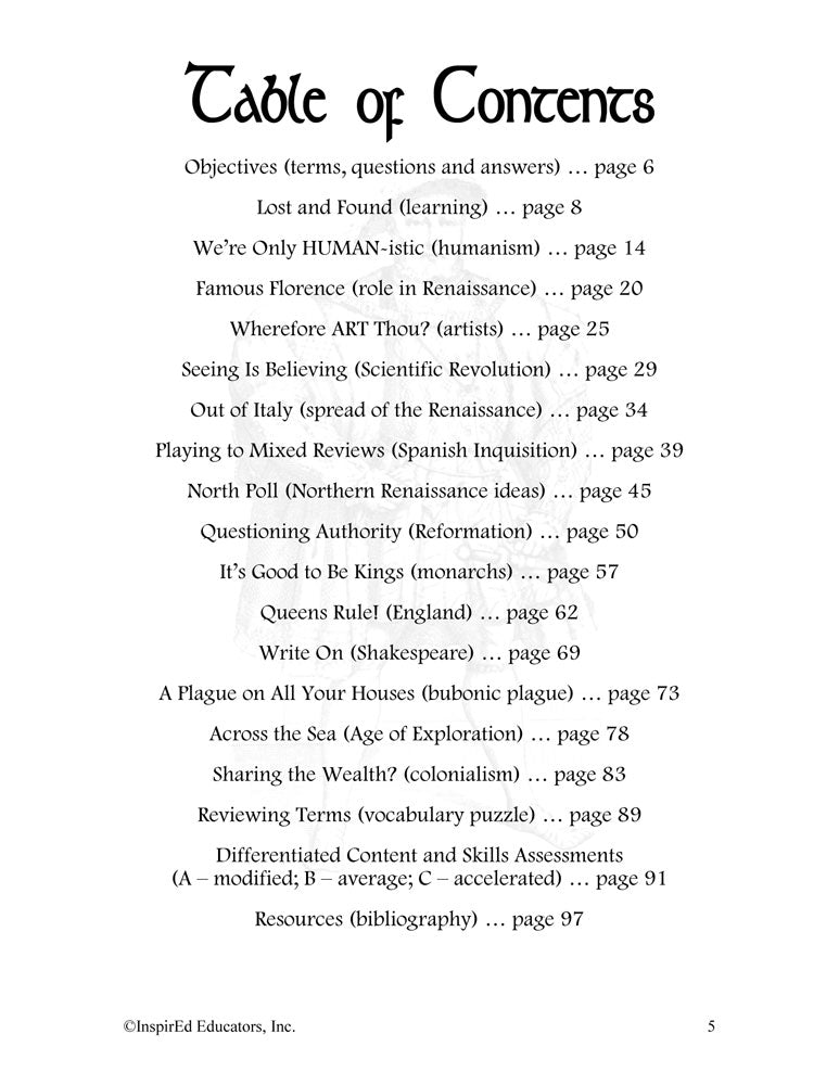 Topics include Marco Polo's journey, Humanism, the Medici family, Renaissance art, Galileo, Gutenberg, the Reformation, Queen Elizabeth I, William Shakespeare, the Black Death, and the Age of Exploration. This unit consists of complete and easy-to-use lesson plans along with study guides and differentiated tests.